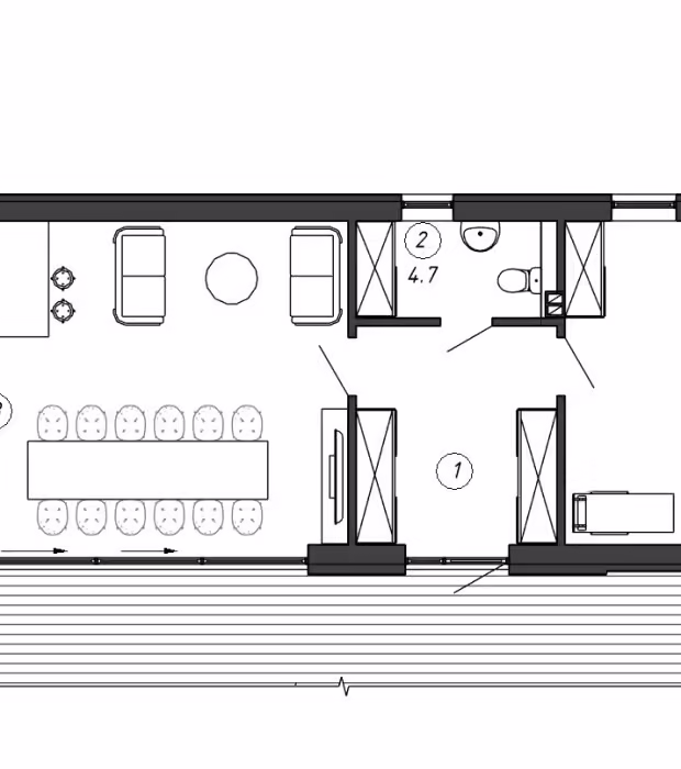 В этом проекте загородного комплекса на участке рядом с жилым домом размещен спа комплекс. В его состав входит кухня, гостиная с панорамным остеклением, релакс зона и комплекс помещений парной. В наружной отделке используется сочетание клинкерной плитки, клинкерного кирпича и штукатурки, за счёт чего формируется пластика на фасадах.
