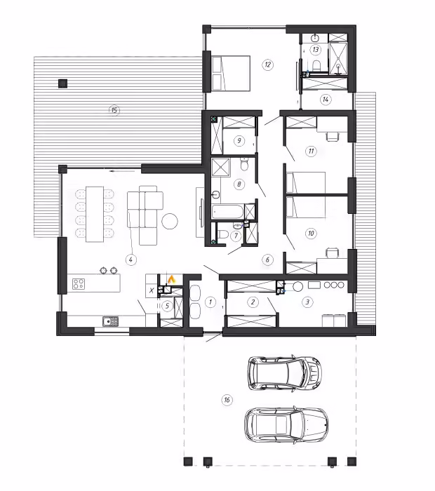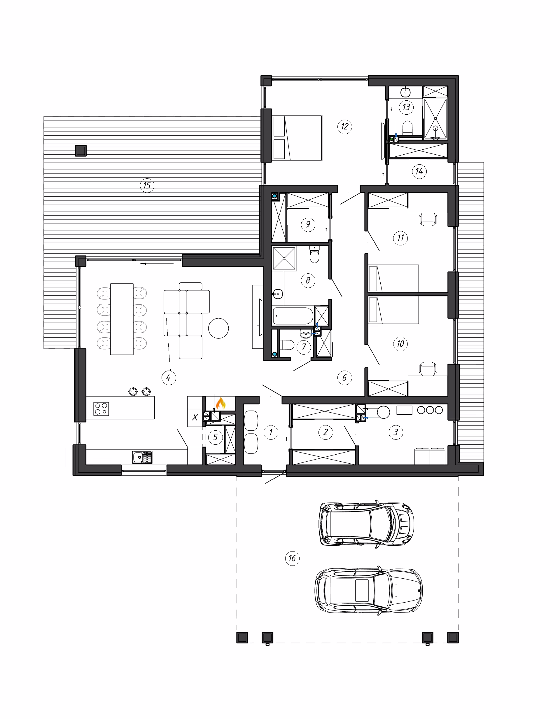 Компактный одноэтажный дом, который внешне кажется больше из-за своих выступающих элементов. Данный эффект особенно характерен для домов небольшой площади, размеры террасы и навеса для автомобилей в большинстве проектов остаются неизменными и в сочетании с основным объемом дома общая композиция воспринимается более масштабно. В интерьере получилось разместить просторную кухню-гостиную, мастер спальню и две детские комнаты. В отделке фасадов используется штукатурка в сочетании с планкеном.