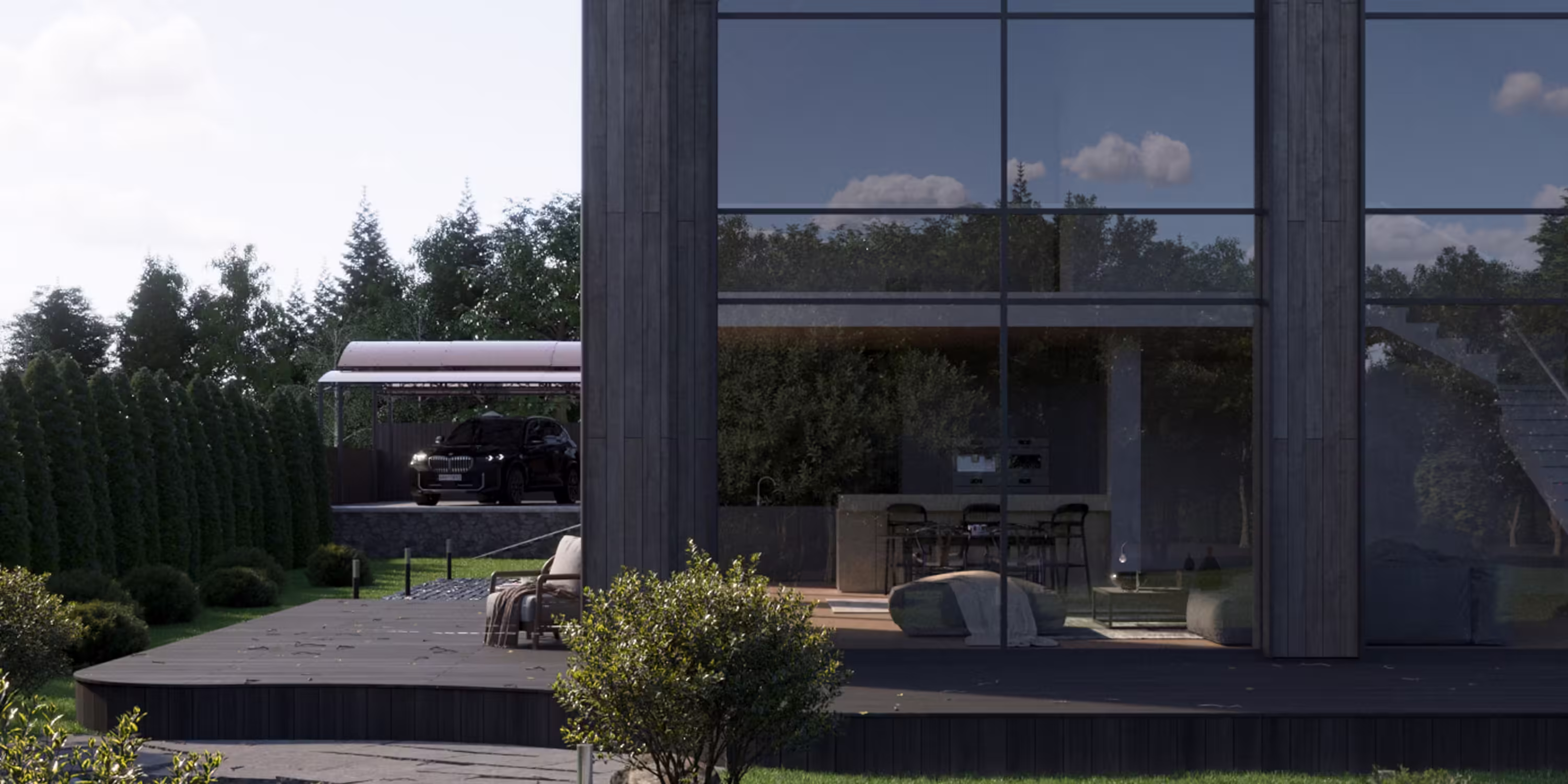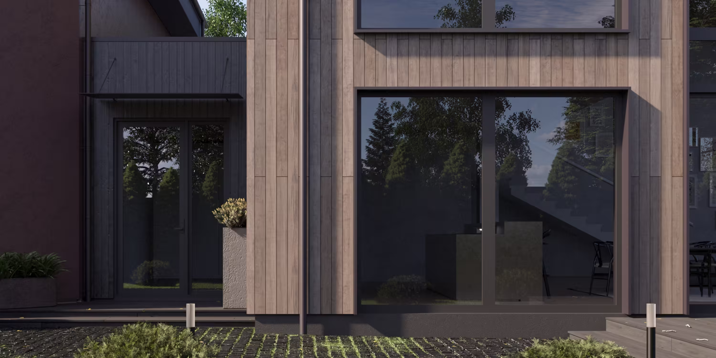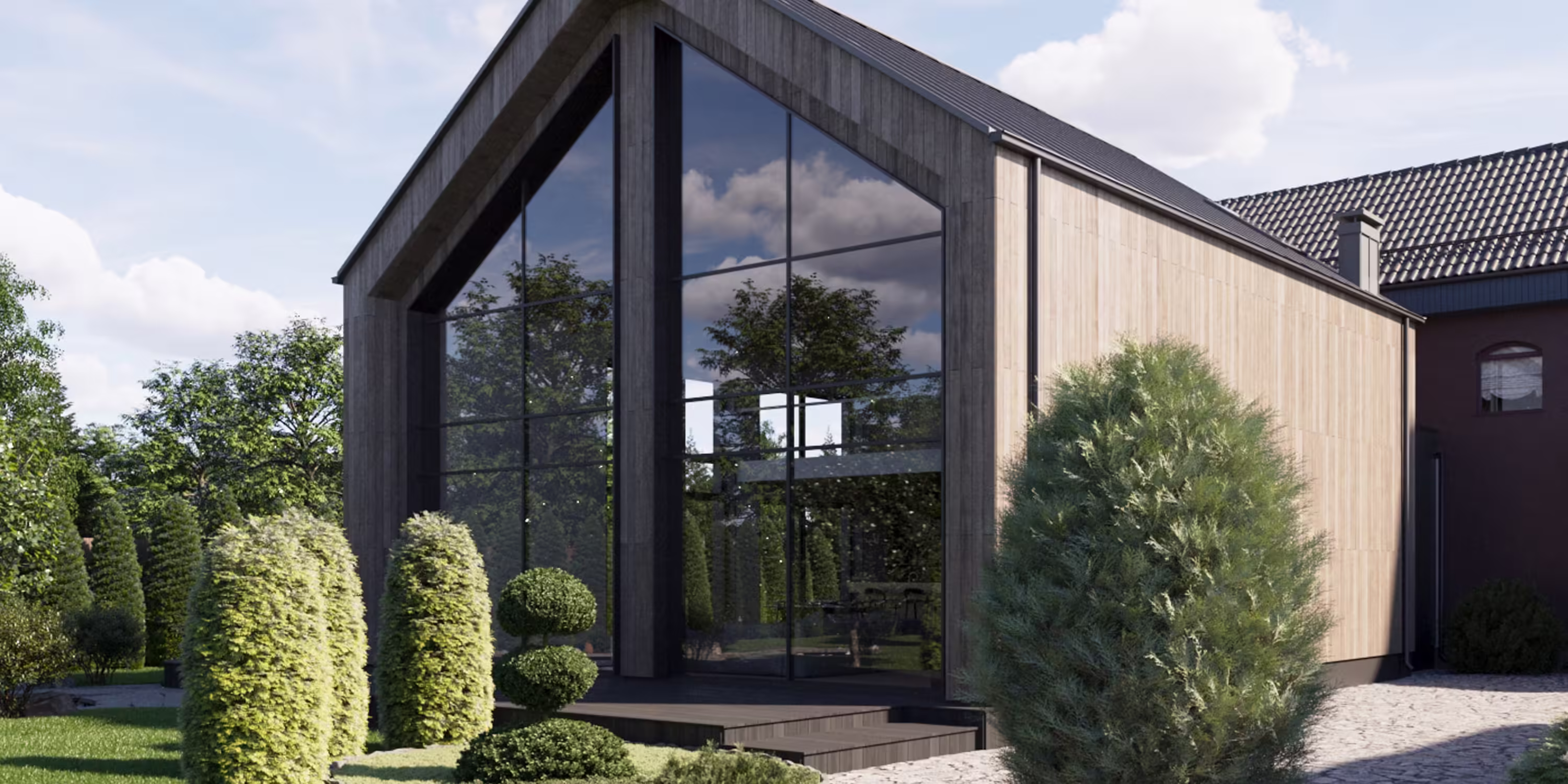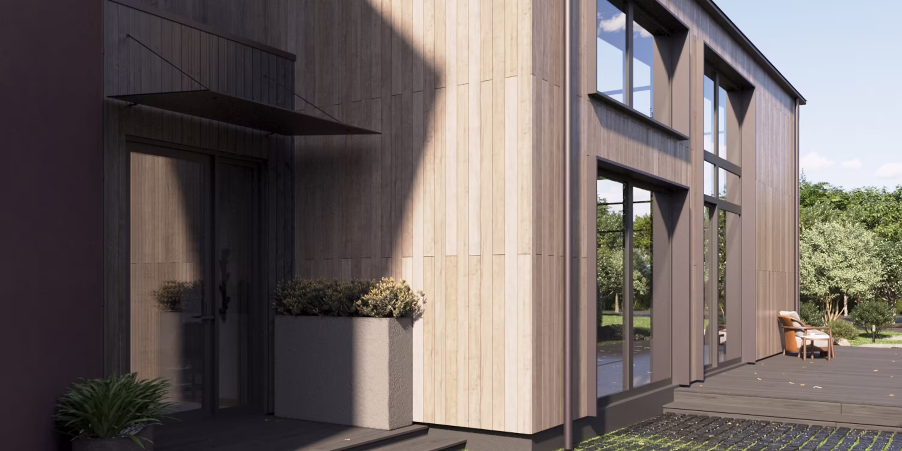 Дом в скандинавском стиле, который отлично впишется в участок с выраженным рельефом, водоемом, густым озеленением или вблизи бескрайних полей. Отличительными чертами является отделка из вертикального планкена, фальцевая кровля с крутыми скатами без свесов, а так же большое остекление со вторым светом.