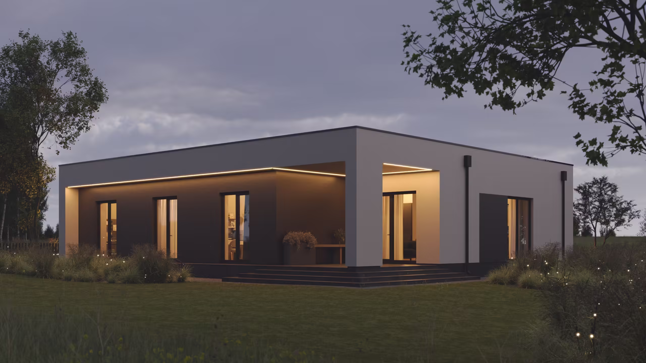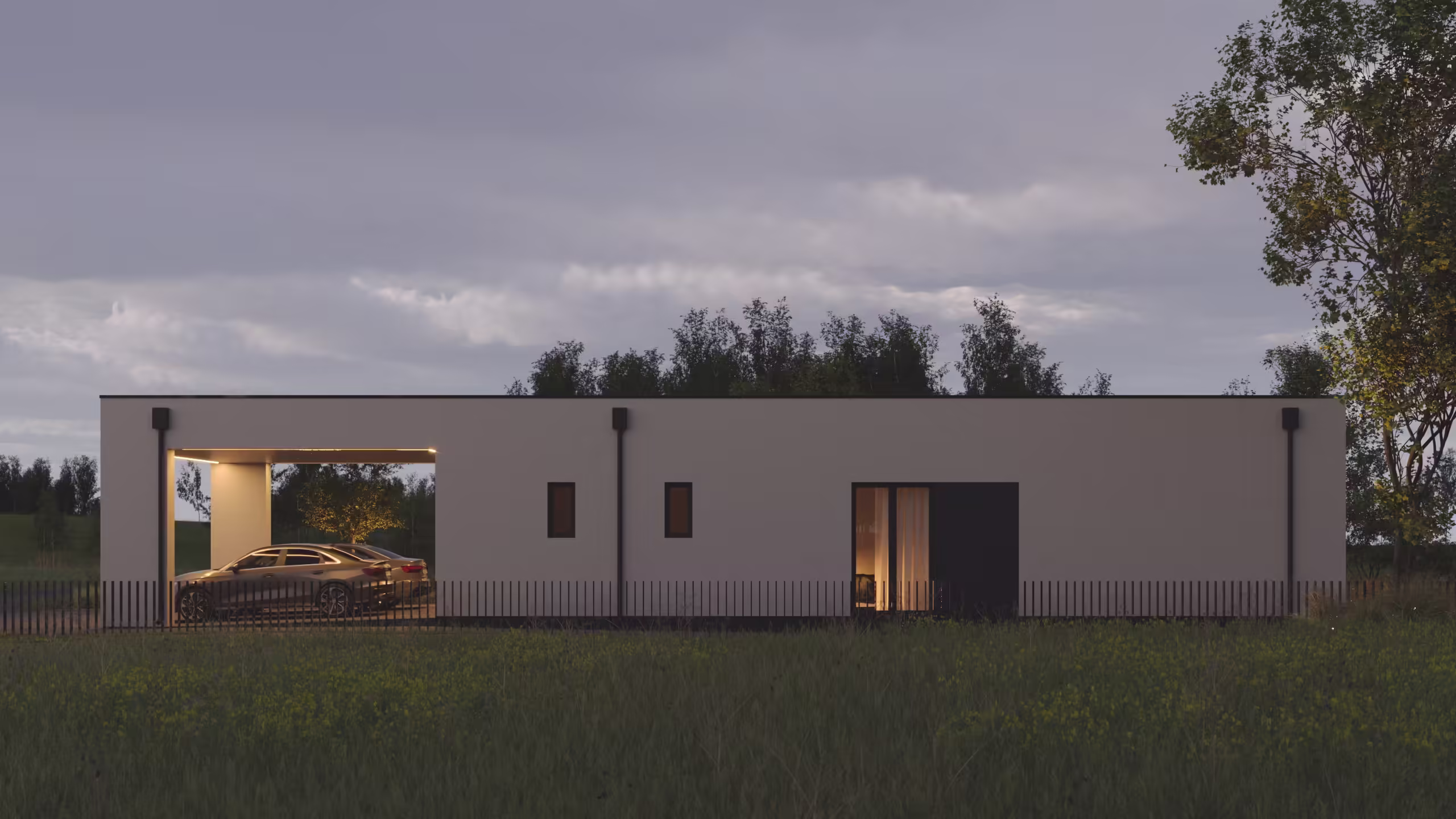 Минималистичный дом с гаражом и навесом для автомобилей. В планировке дома нет ничего лишнего все помещения размещены очень компактно но функционально.