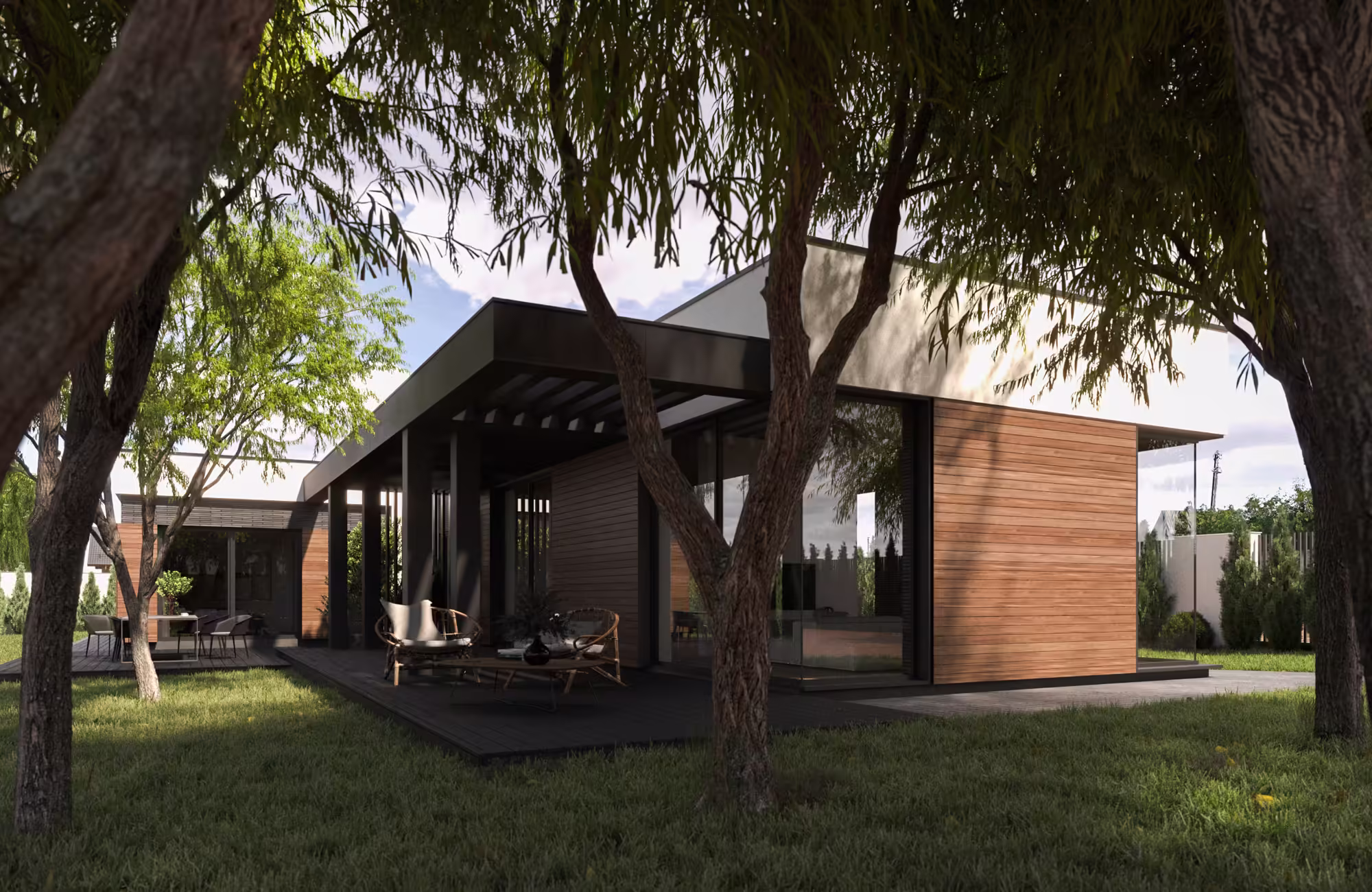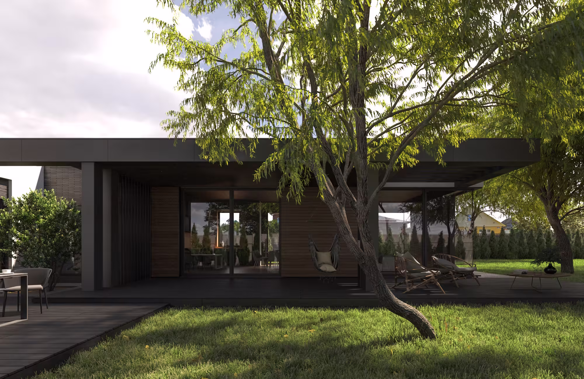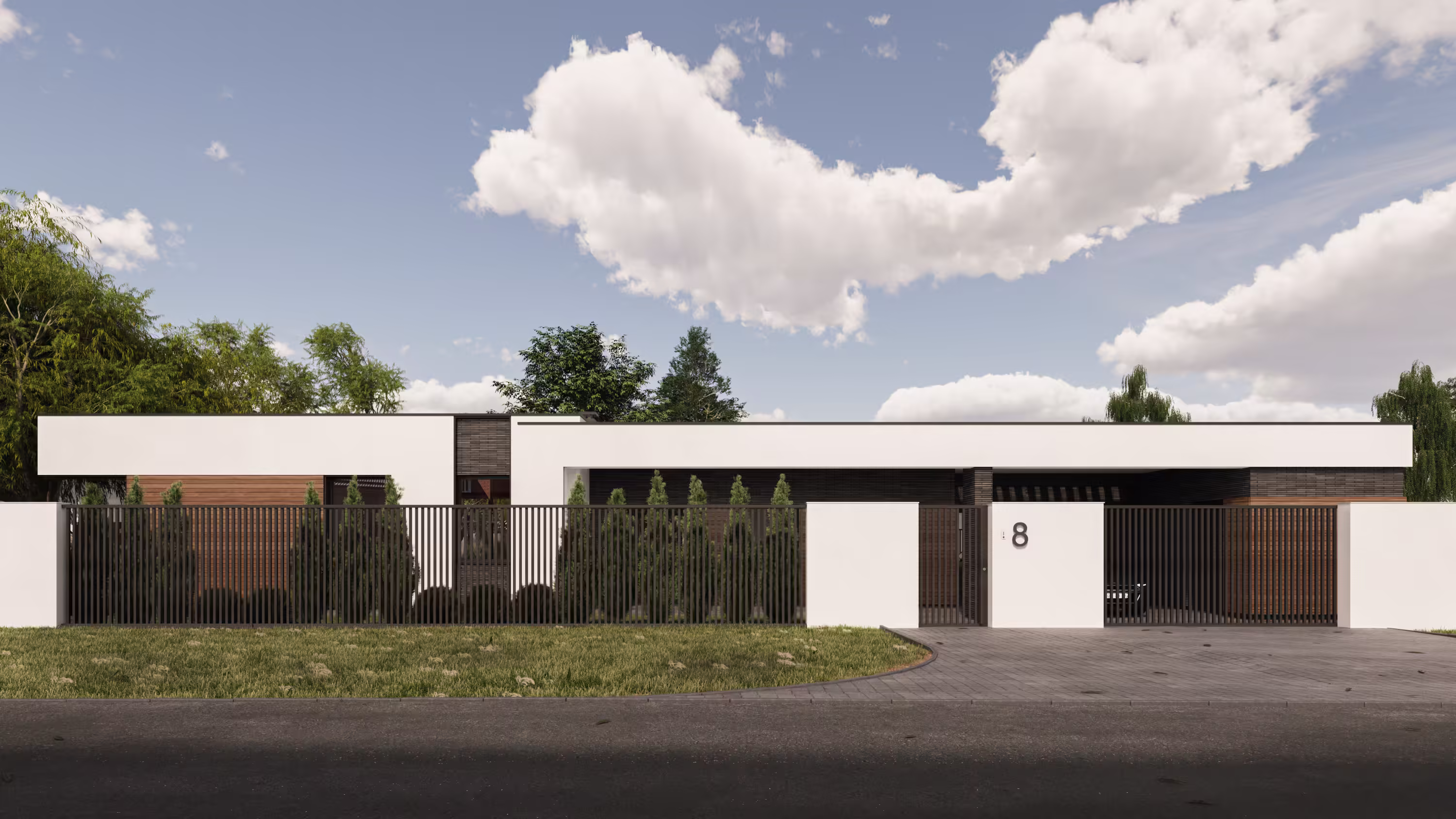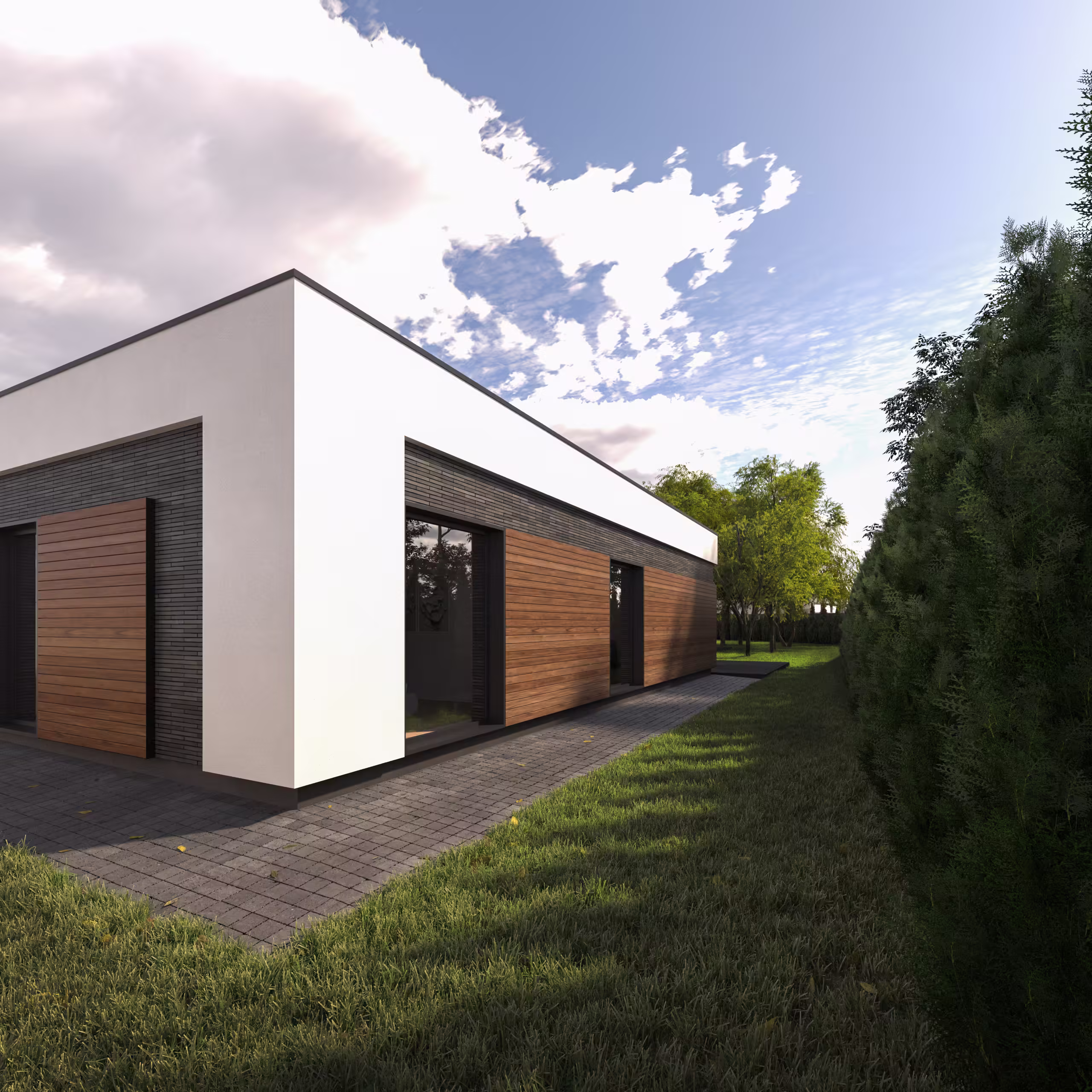 Отдела фасадов получилась контрастной, за счёт сочетания белой штукатурки и темной клинкерной плитки, что позволило выделить отдельные участки и создать динамичную композицию, а вставки из горизонтального планкена добавили теплого природного оттенка дерева.