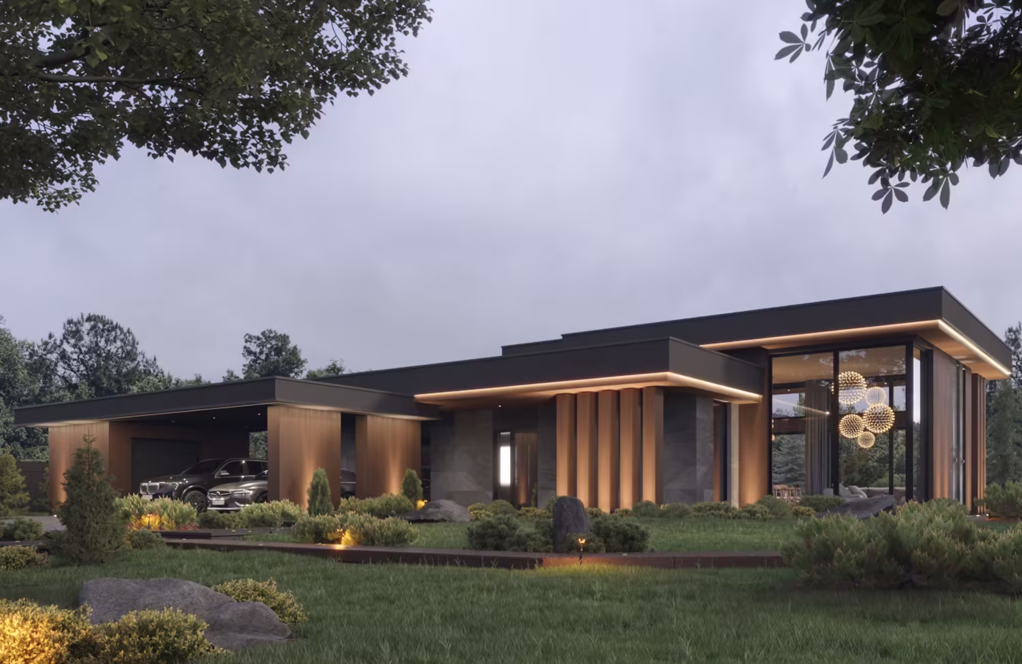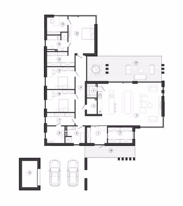 Одноэтажный дом со вторым светом в кухне-гостиной и огромной крытой террасой! В данном проекте реализованы лучшие приемы проектирования домов такого формата. Навес для автомобилей соединен с хозяйственной постройкой и главным входом в дом.