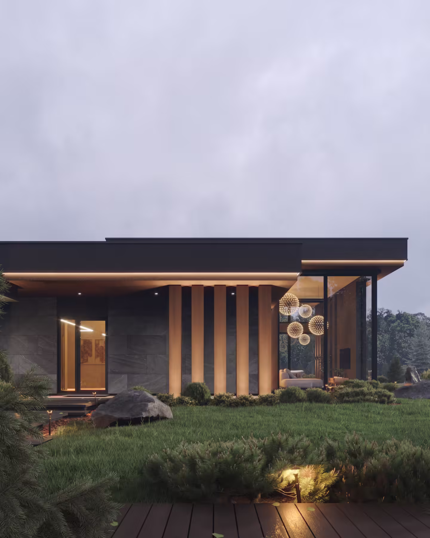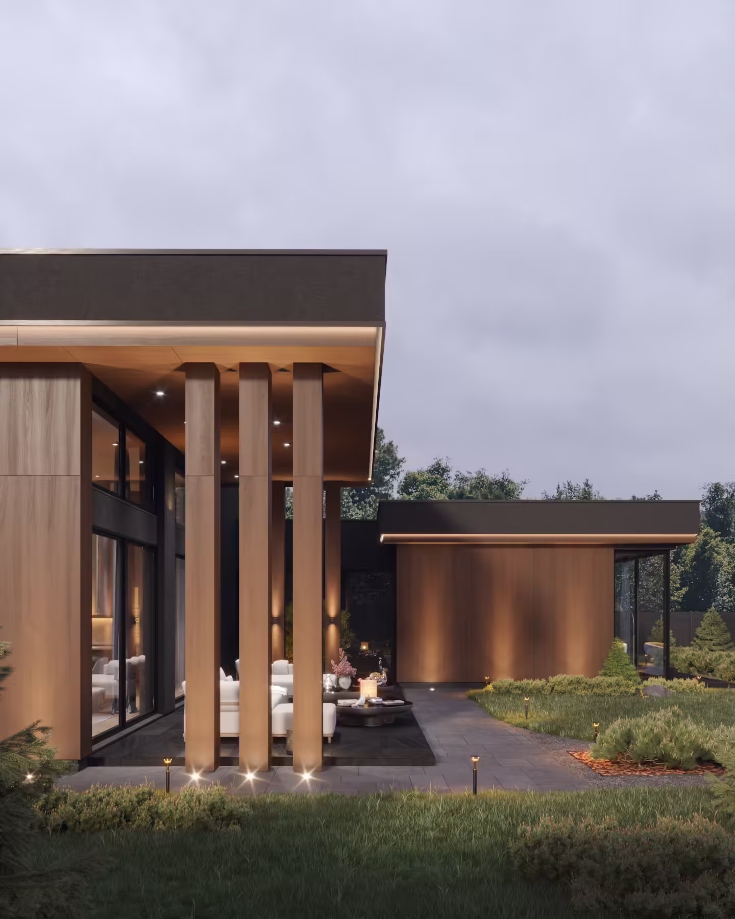 Спальни сгруппированы в отдельный блок и отделены от гостиной, но при этом коридор освещается большим окном с видом на террасу и декоративное дерево. В мастер спальне, как и в гостиной, панорамное остекление с ориентацией на лучшие виды участка.