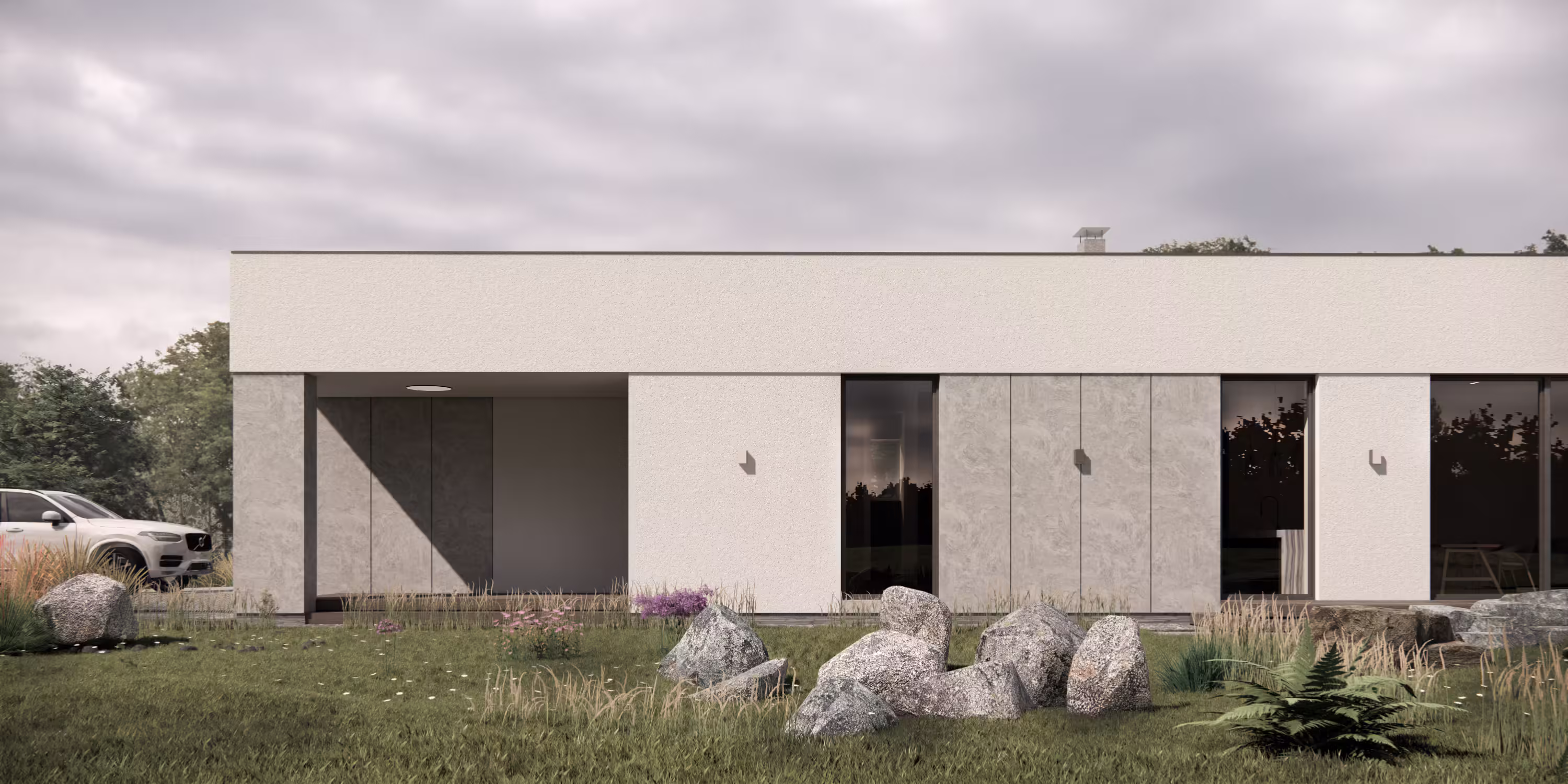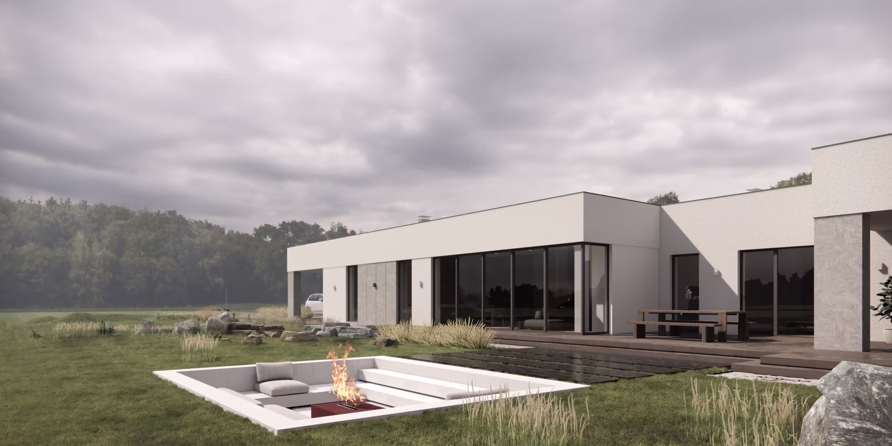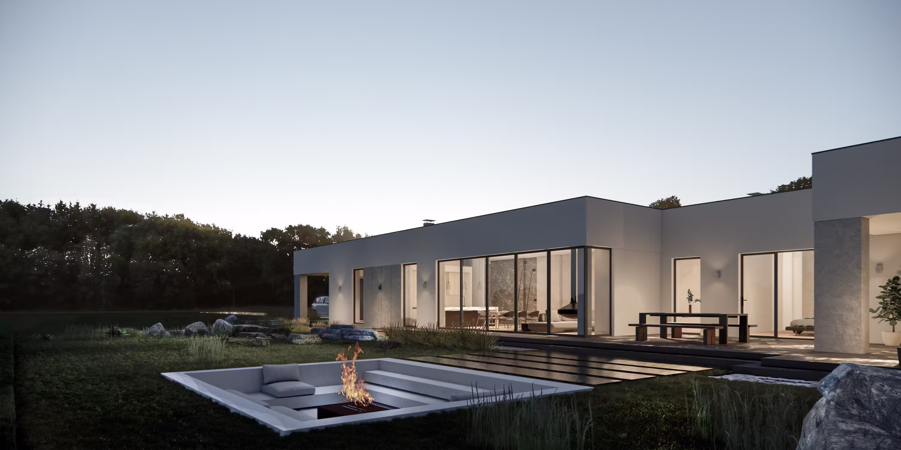 Современный минимализм, эффективное использование строительных обьемов и прагматичный функционал. Строгое зонирование дома и территории. И конечно лаунж зона с костищем, место сбора всей семьи.