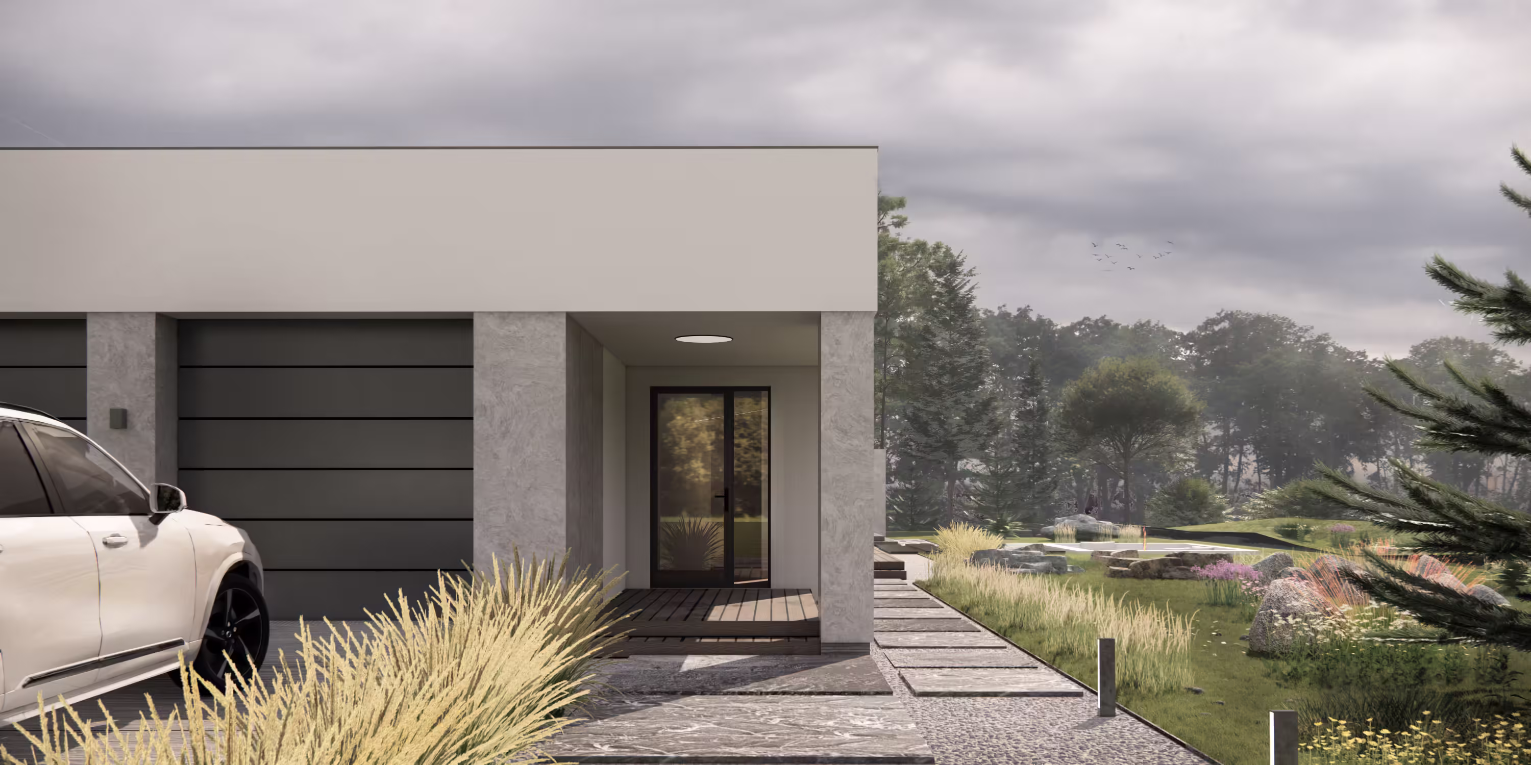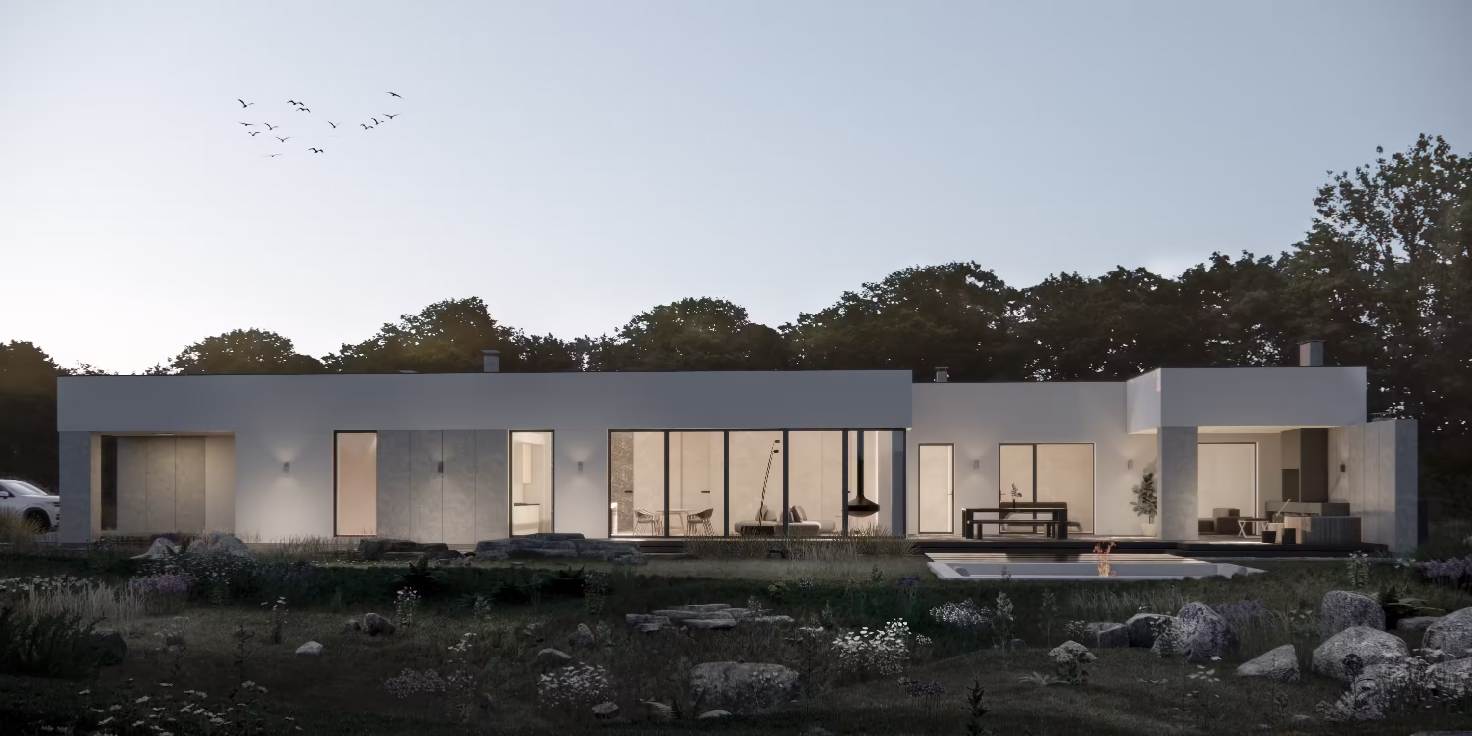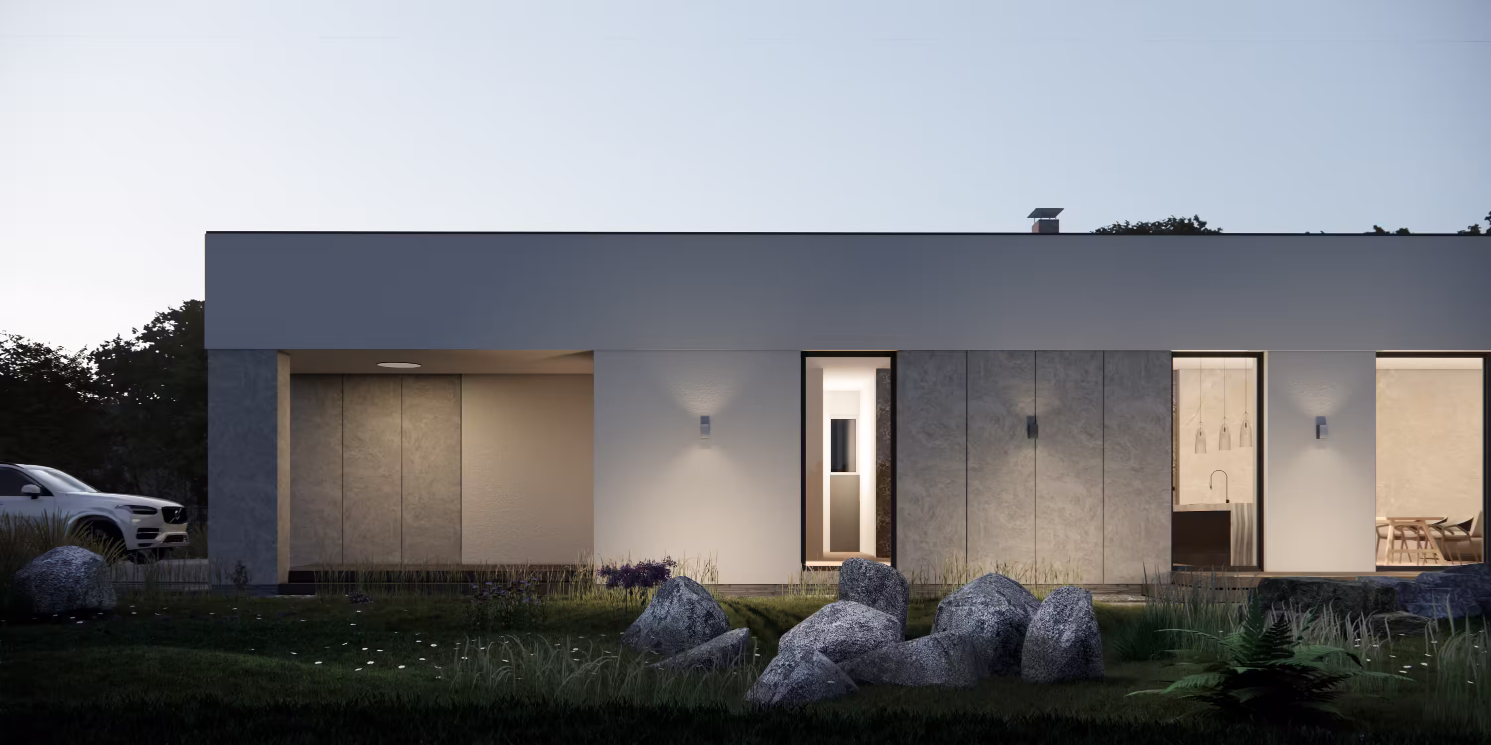 Современный минимализм, эффективное использование строительных обьемов и прагматичный функционал. Строгое зонирование дома и территории. И конечно лаунж зона с костищем, место сбора всей семьи.