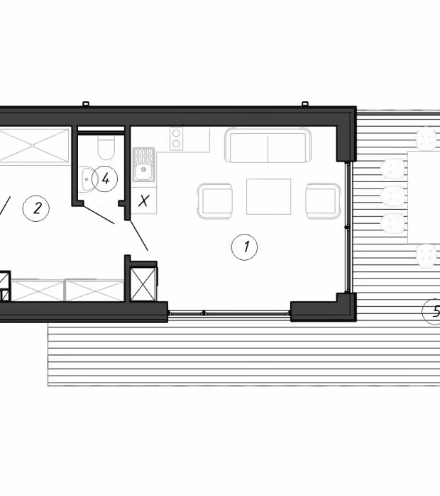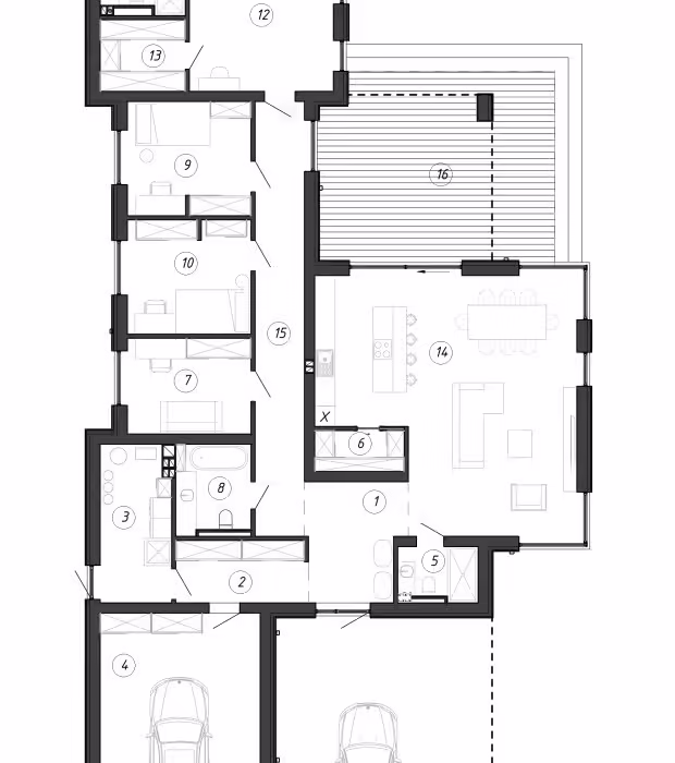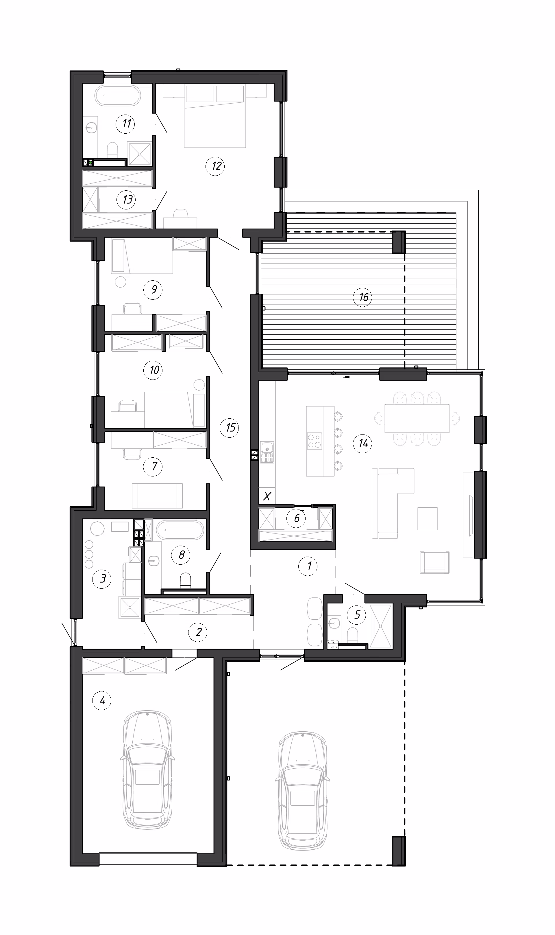 Одноэтажный дом с отделкой из белой клинкерной плитки в окружении зелени смотрится максимально эффектно! В композиции фасадов выделяется высокая центральная часть кухни-гостиной, а по бокам от нее разместились навес для автомобиля и крытая терраса. Рядом с прихожей расположена просторная кухня-гостиная с окнами в пол и выходом на террасу. В отдельную жилую зону сгруппированы две детских спальни, кабинет и мастер спальня со своим санузлом и гардеробной.