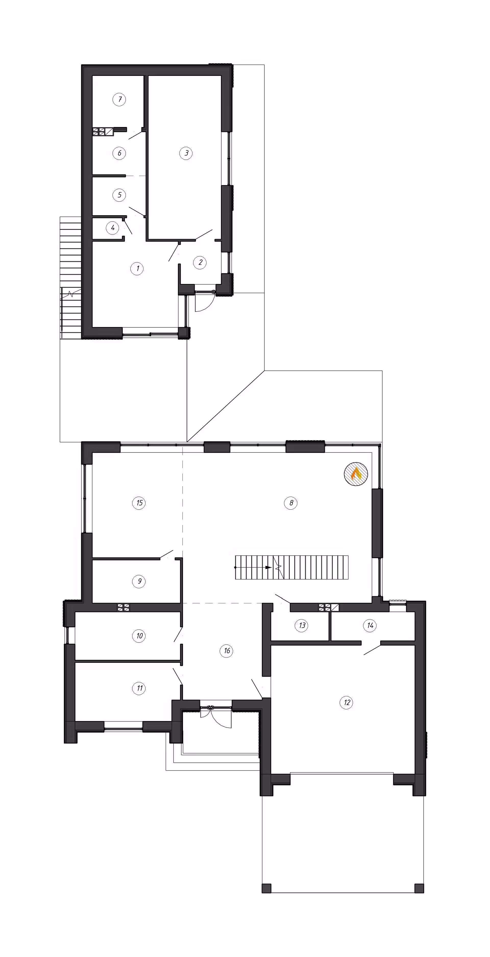 Двухэтажный объем переходит в одноэтажную часть блока СПА через навес, под которым организована терраса с выходом из столовой.