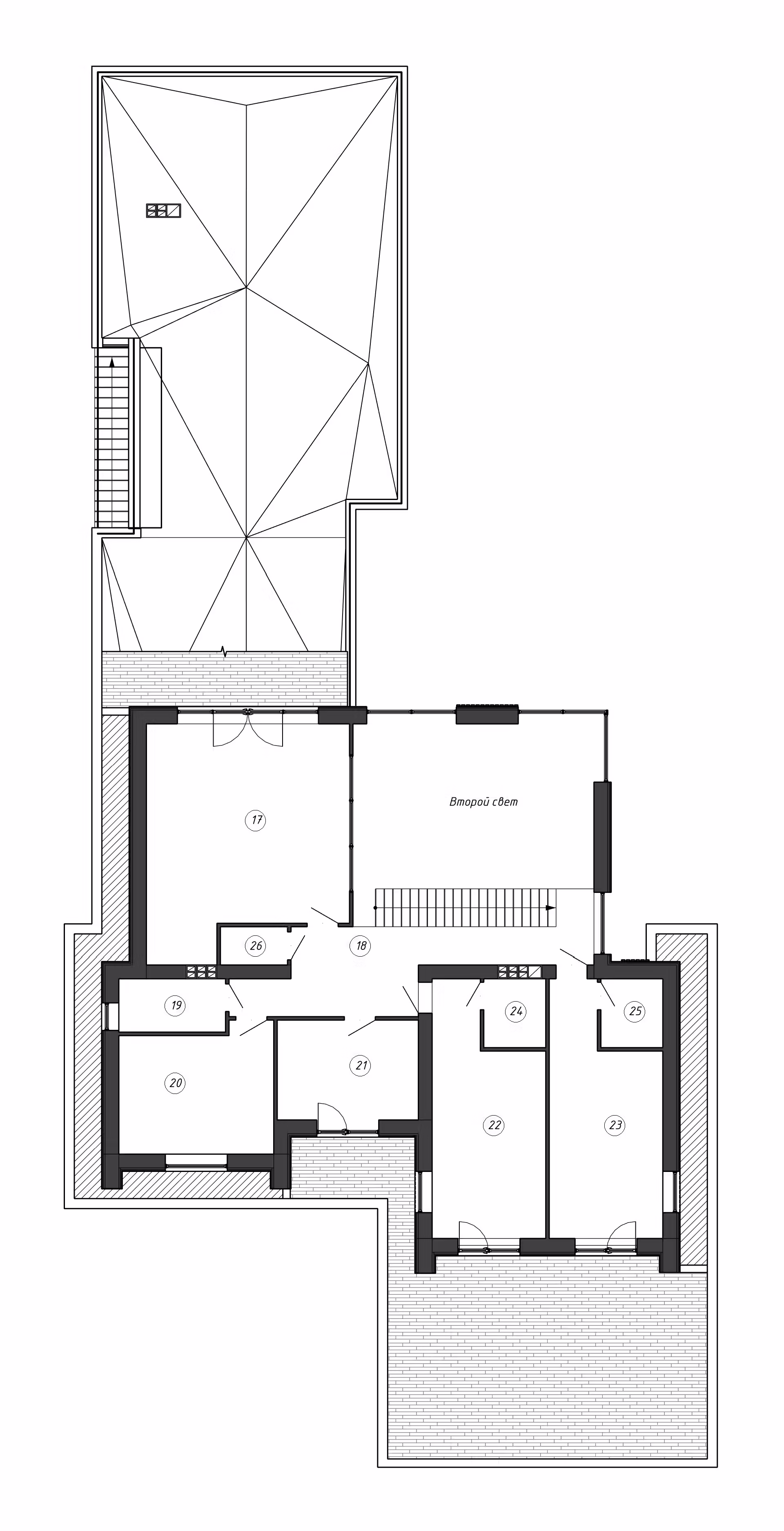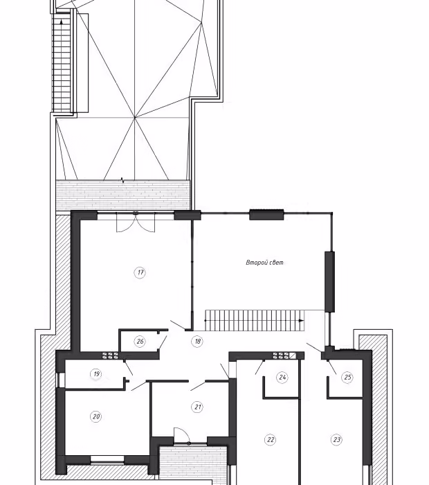 Второй свет на два этажа в гостиной с характерным угловым остеклением позволяем максимально раскрыть вид на внутренний двор.