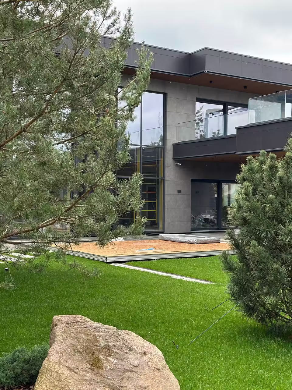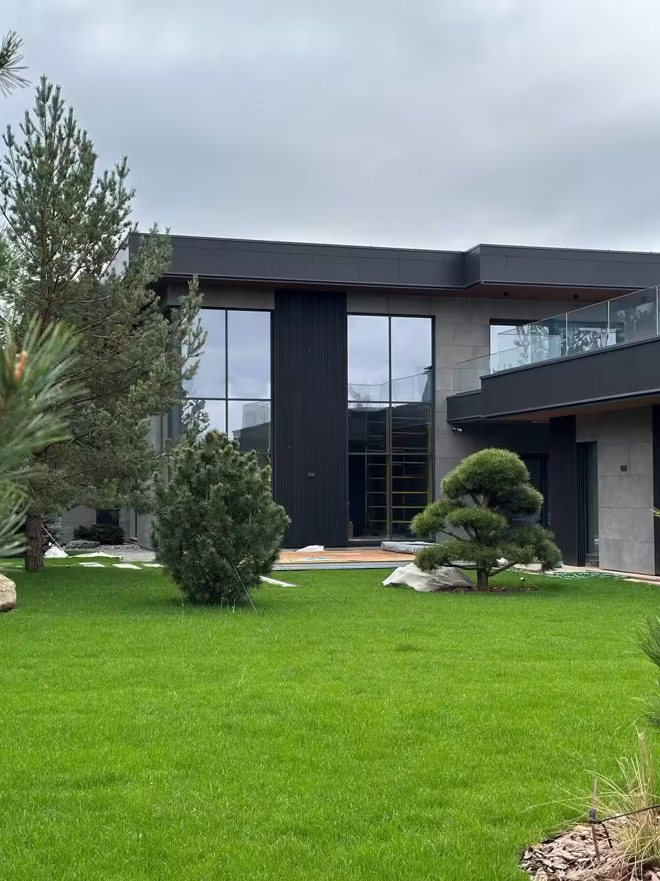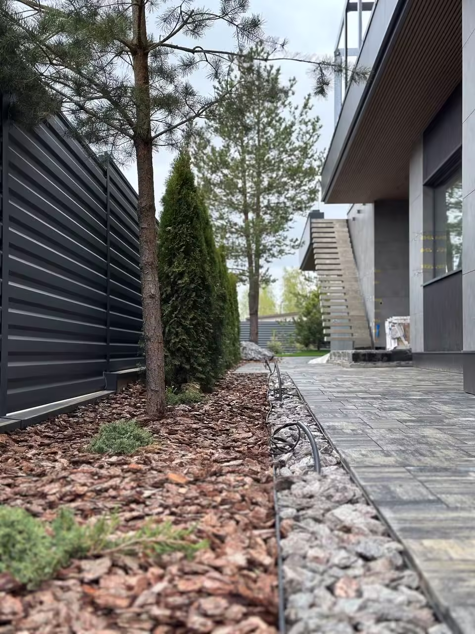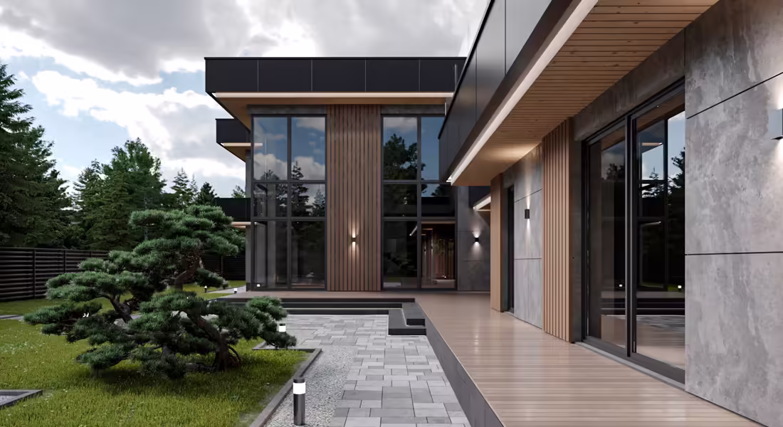 В отделке фасадов использован керамогранит и декоративные реечные панели из ДПК.