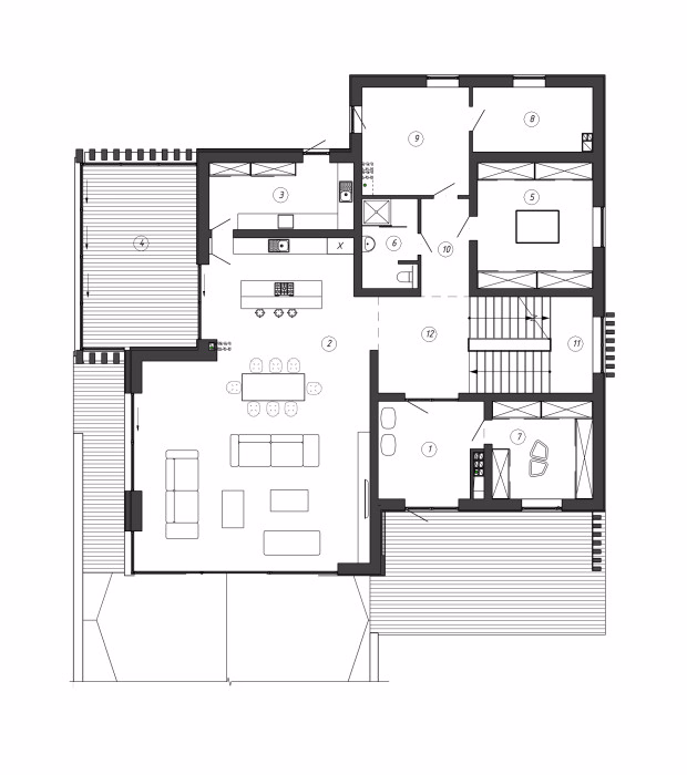 В доме реализована концепция поэтажного зонирования, на первом этаже большая кухня гостиная и технические помещения, на втором этаже три спальни, каждая со своим санузлом и гардеробной.