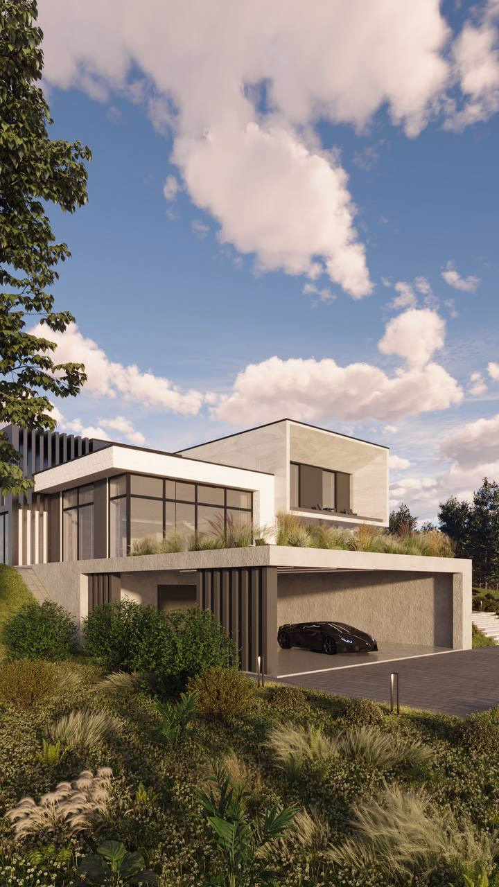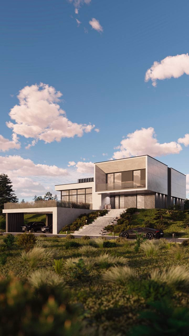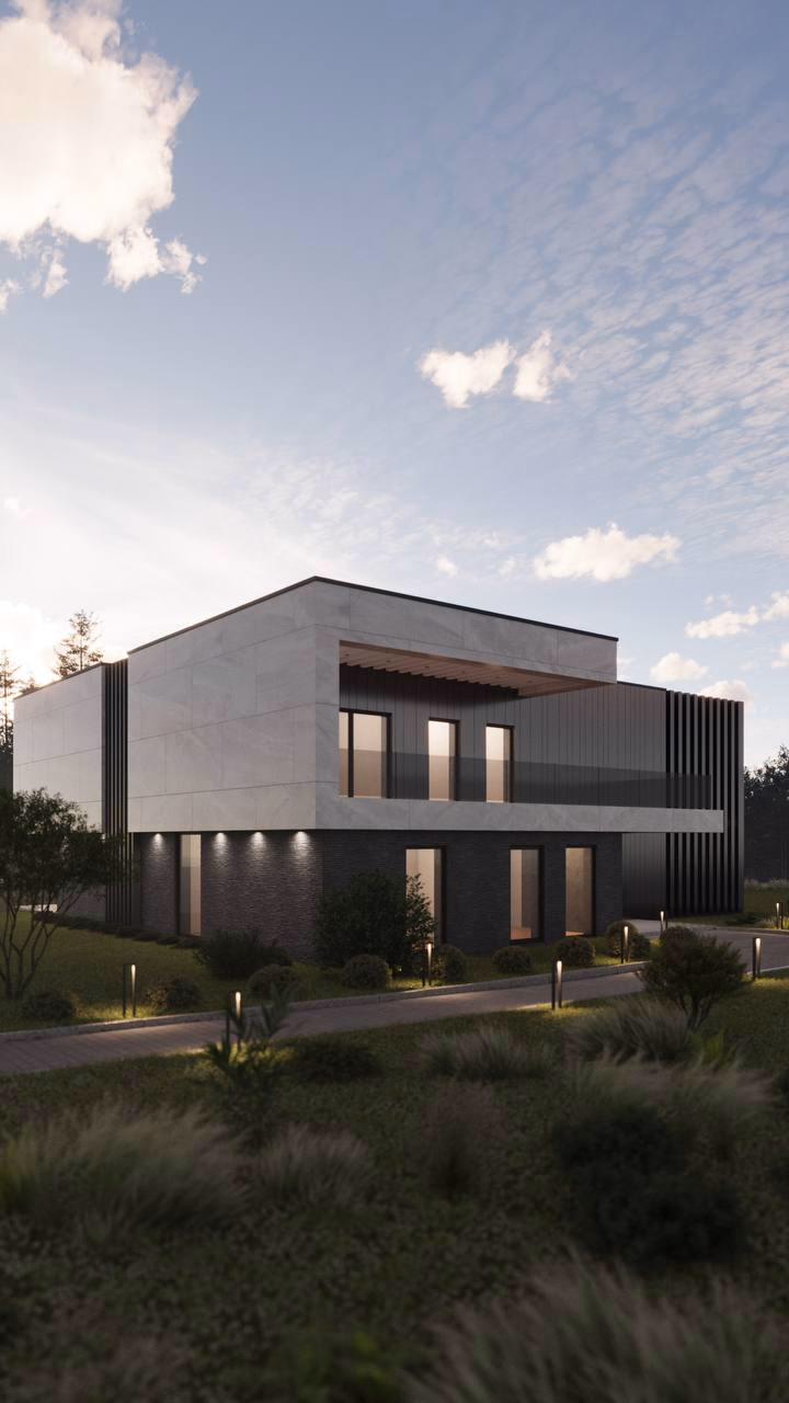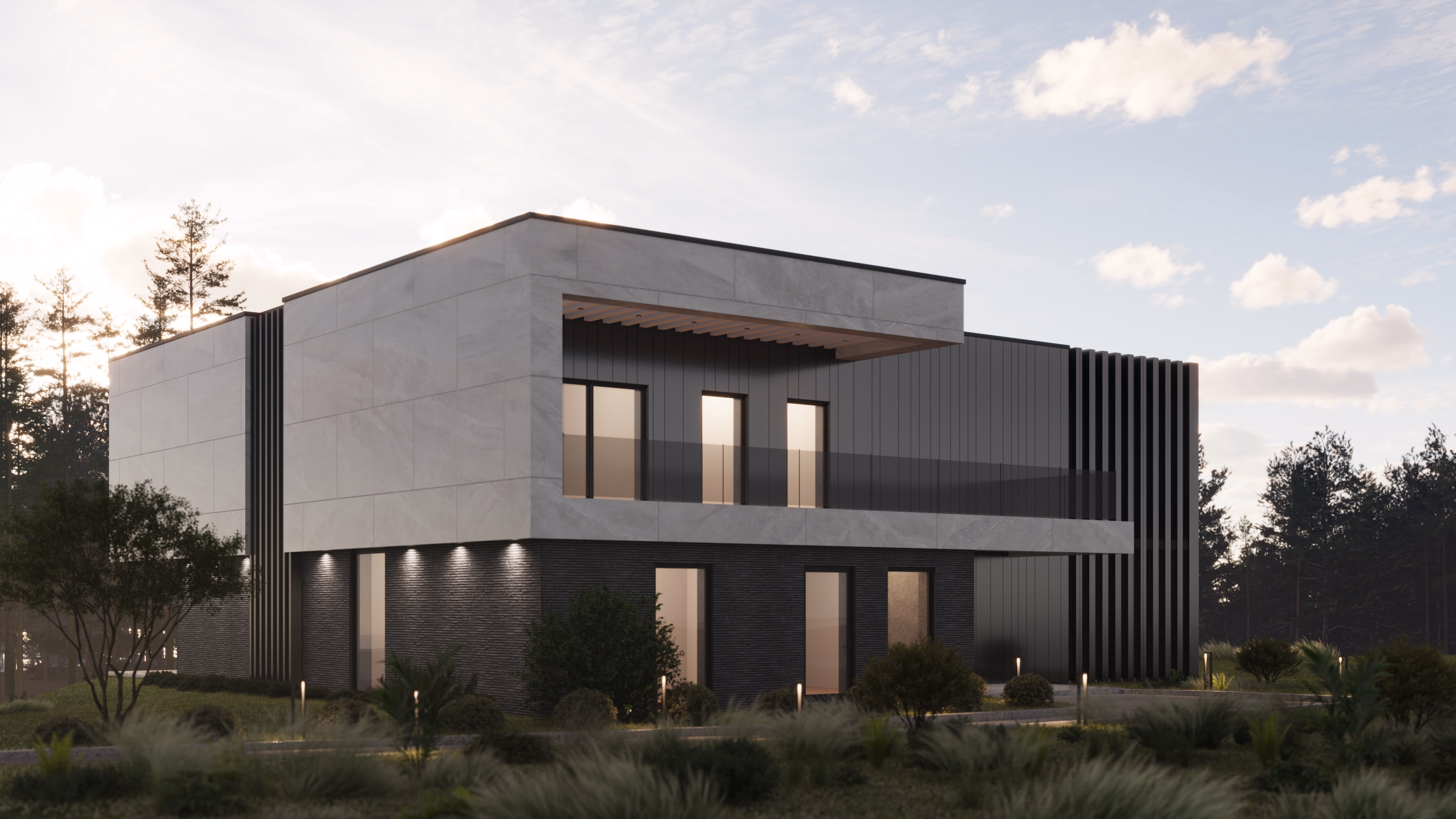 Композиция экстерьера сочетает в себе большое остекление с ориентацией на видовые точки прилегающей территории, выделенные разным материалом отдельные объемы здания, выступающие консоли и навесы в различном исполнении, террасы и балконы с перголами и наклонным поверхностями.