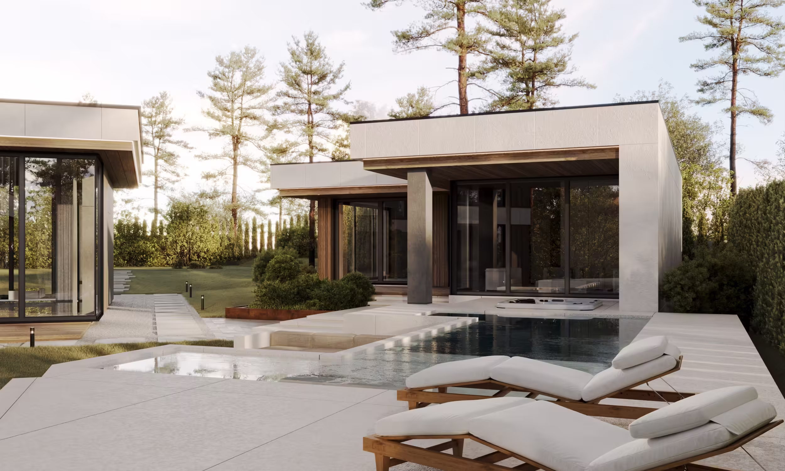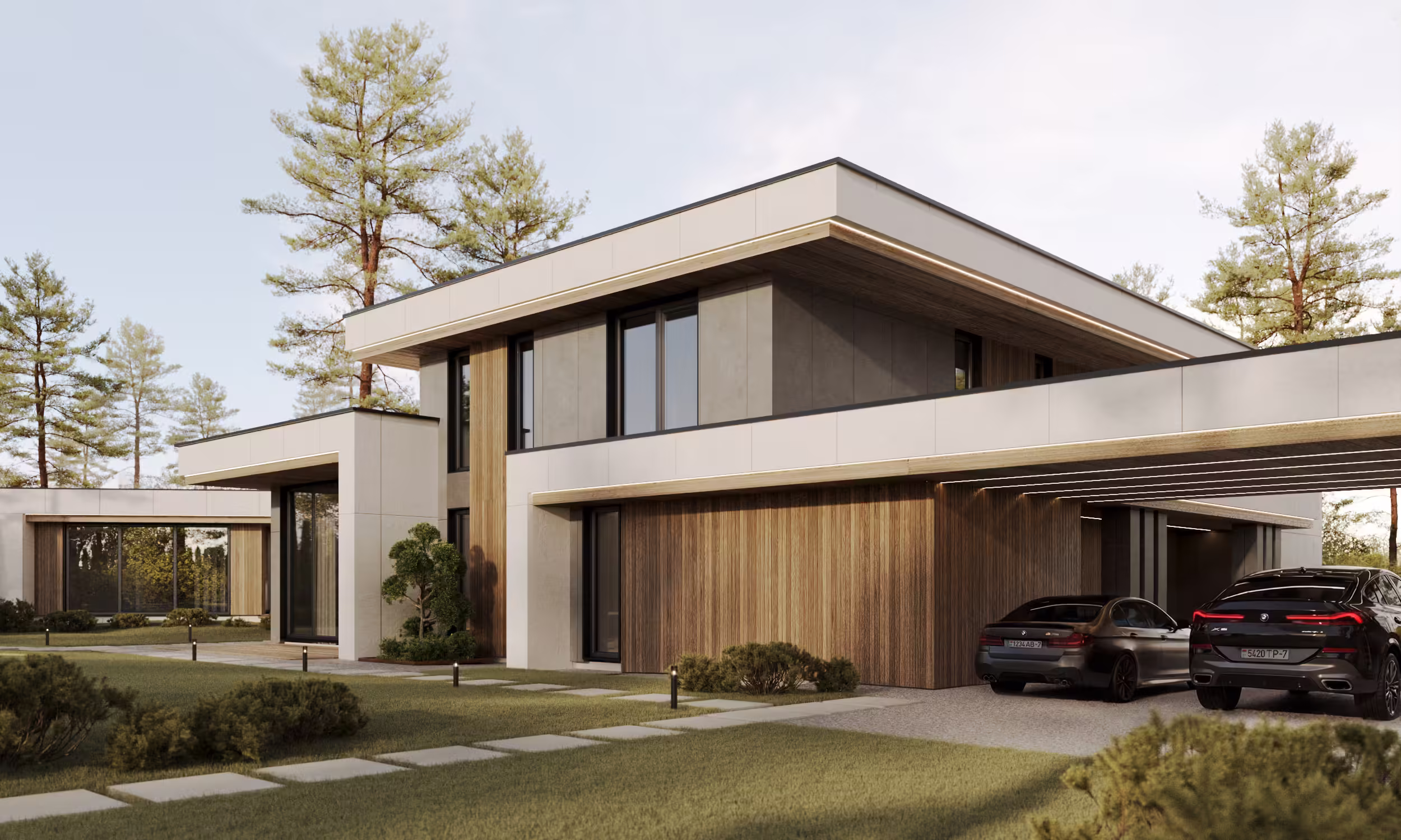 В составе комплекса запроектирован двухэтажный жилой дом, навес для двух автомобилей совмещённый с хоз. постройкой и отдельно стоящий СПА блок с террасой BBQ и уличной джакузи.