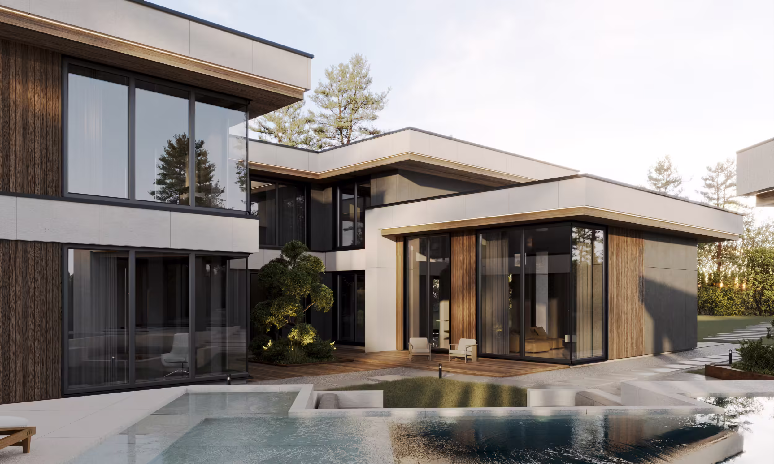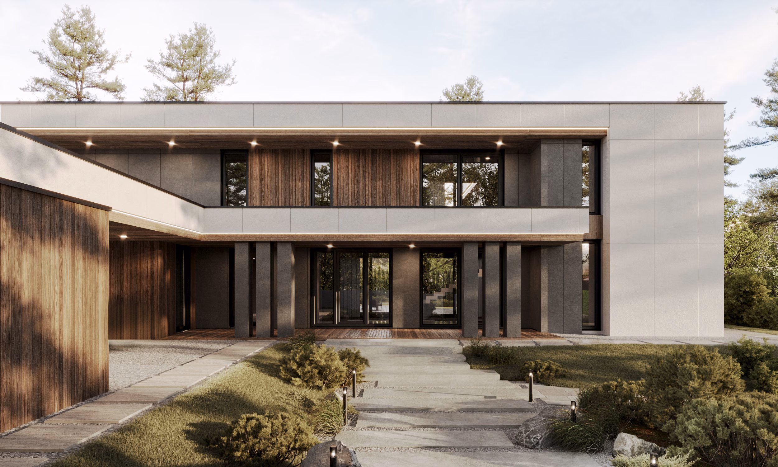 Отделка фасадов сочетает в себе крупноформатный керамогранит и планкен из термоясеня.