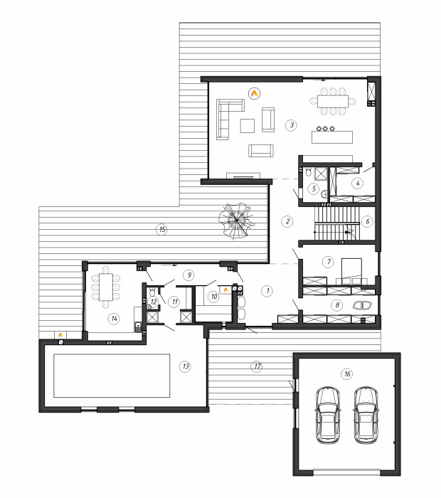 Современный дом в стиле минимализм, совмещает в себе функциональную планировку и лаконичный дизайн. Дом расположен в лесной местности, поэтому важной задачей при проектировании было разместить его так, чтобы максимально сохранить существующие деревья. Функционально дом разделен на несколько зон: гостевую со вторым светом и просторной кухней-столовой, зону спа с бассейном, закрытой террасой и барбекю, жилую зону со спальнями и кабинетом на втором этаже, а так же зону отдыха со спортзалом и кино комнатой и техническую зону в подвале.