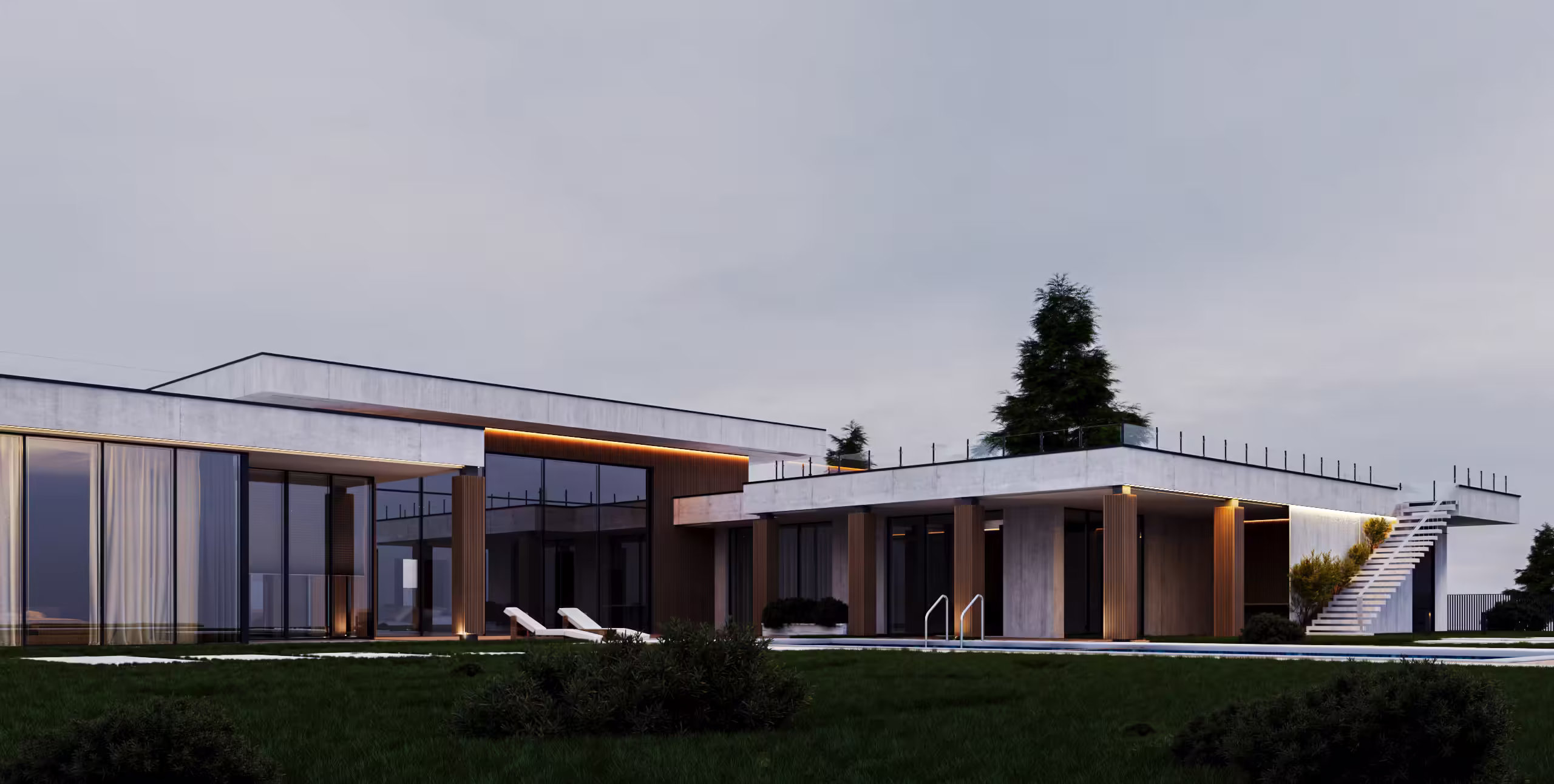 Для создания дополнительных видов над помещениями спа-комплекса организована терраса на крыше, на которую ведет парящая лестница сразу из зоны барбекю.