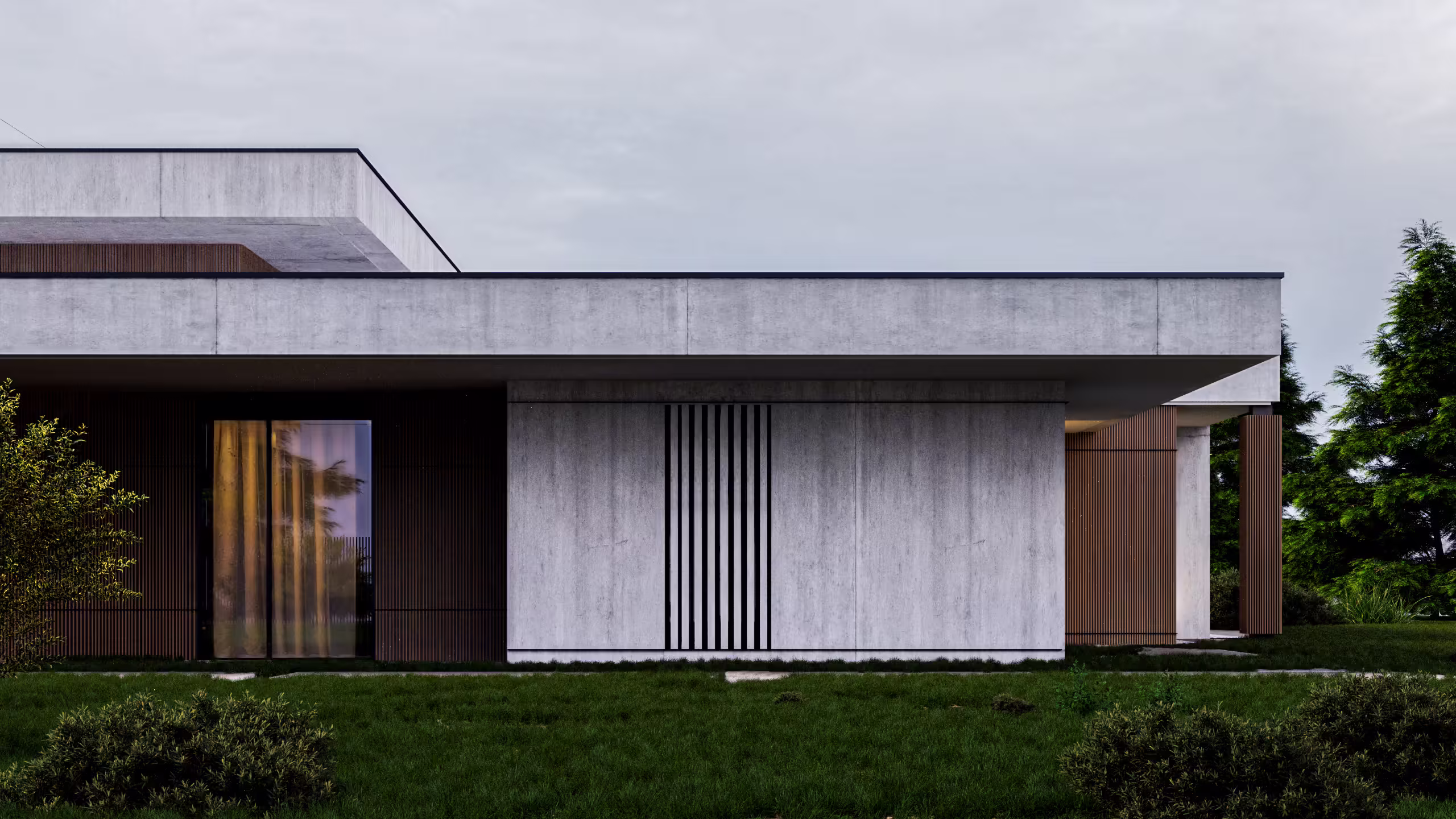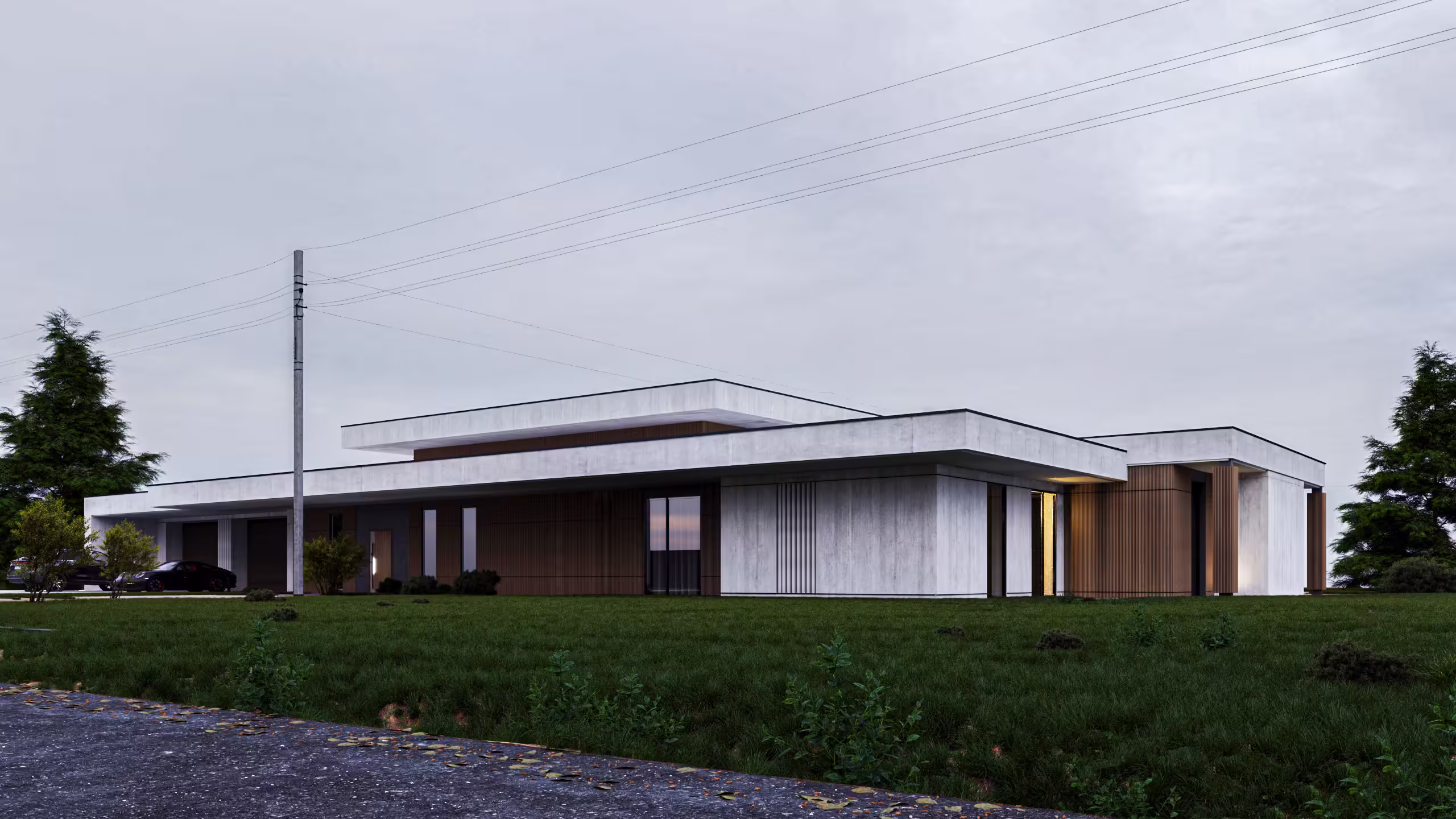 Большие консольные свесы, разноуровневая кровля и сочетание бетона с деревом и стеклом делают экстерьер выразительным и динамичным.