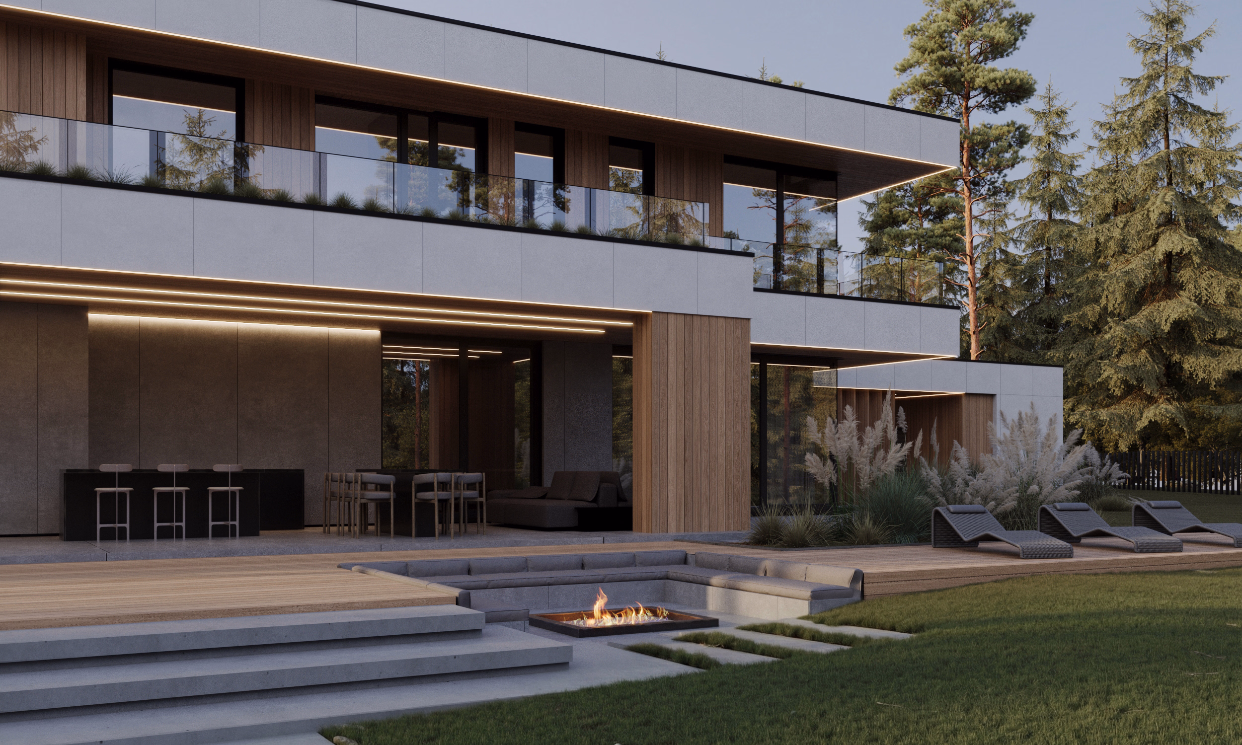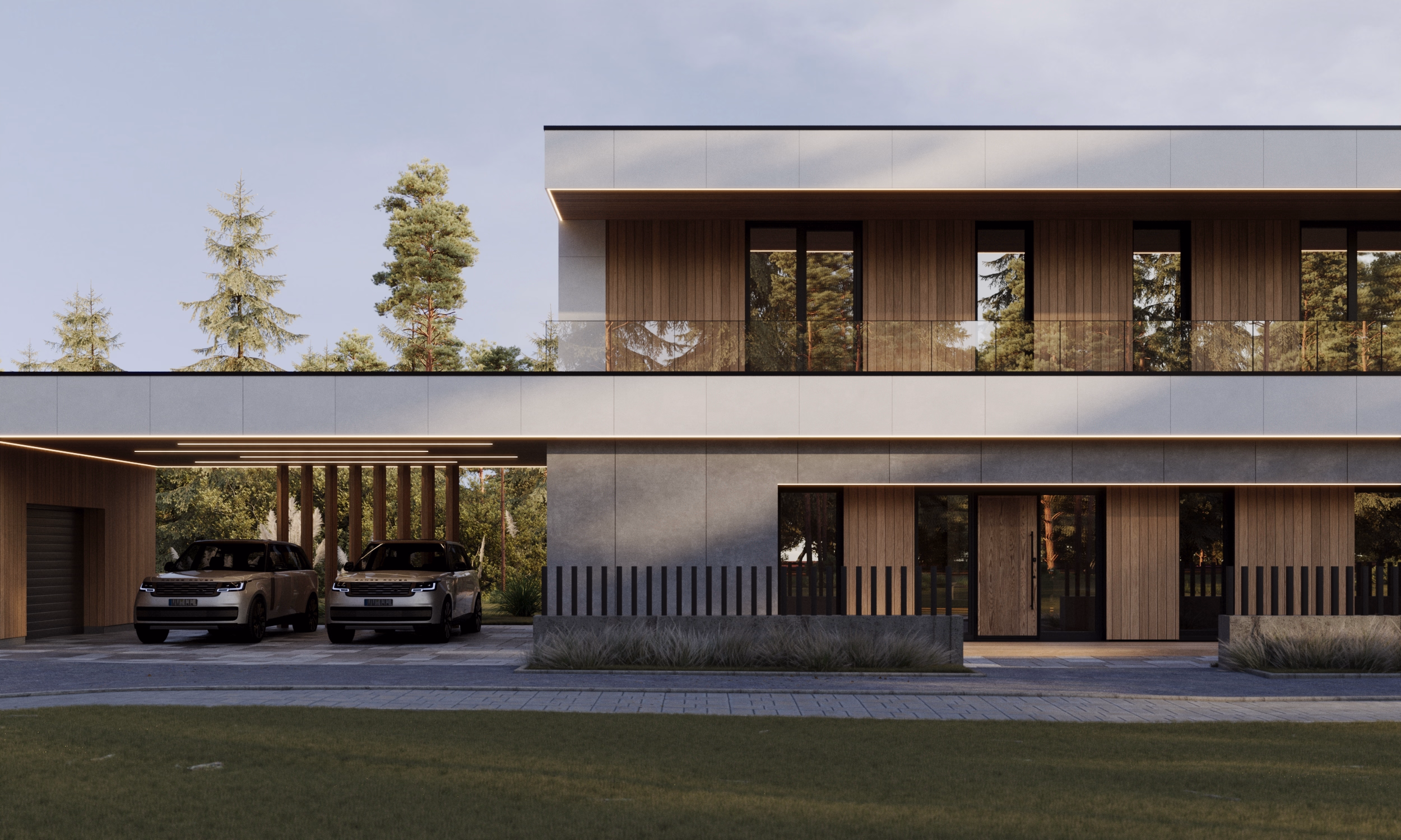Комплекс объединяет в себе двухэтажную жилую часть, СПА блок с бассейном и спортзалом, гараж и большой навес с хозяйственной постройкой. В жилой части рядом с прихожей расположен кабинет и кухня-гостиная с выходом на террасу и зону барбекю.