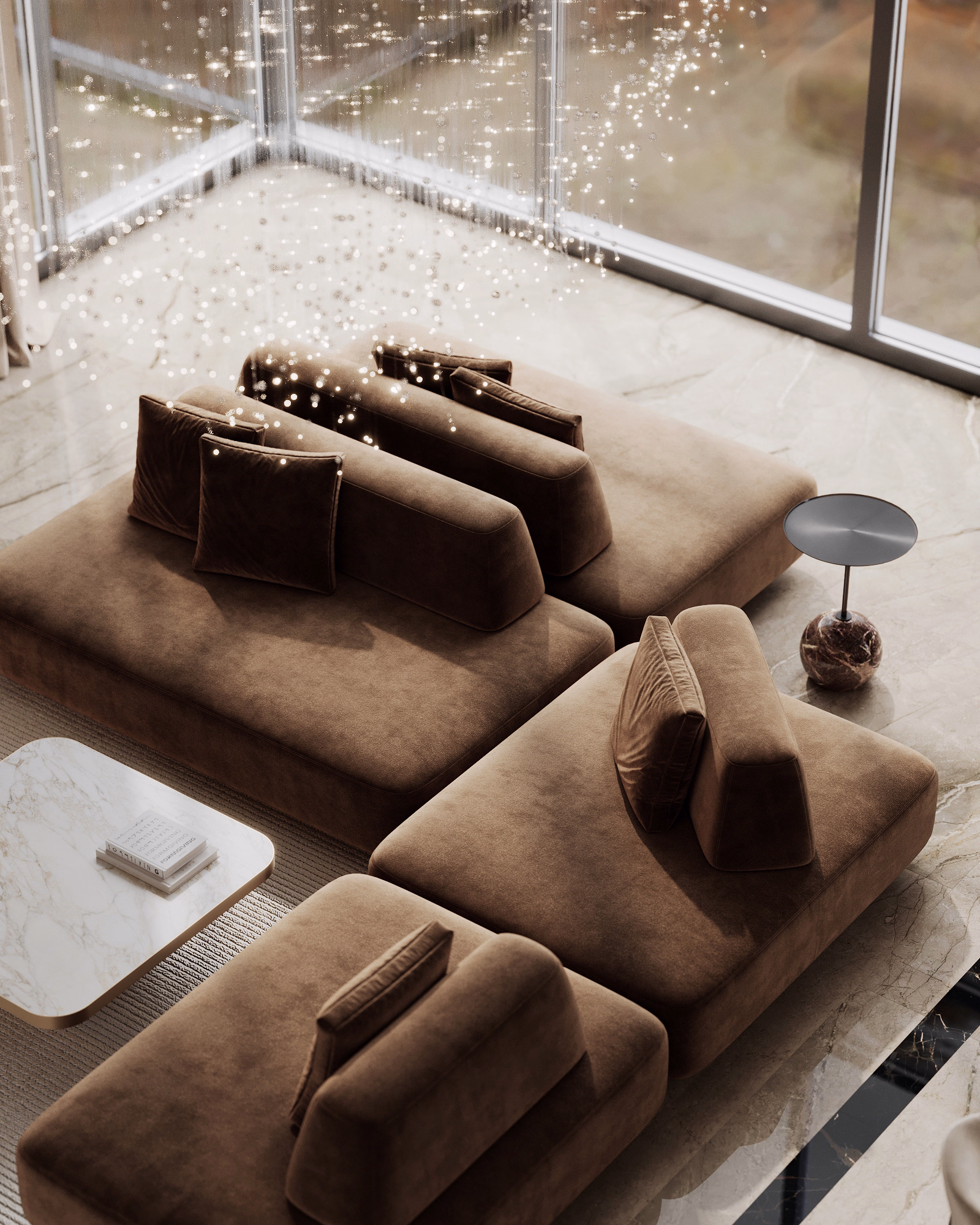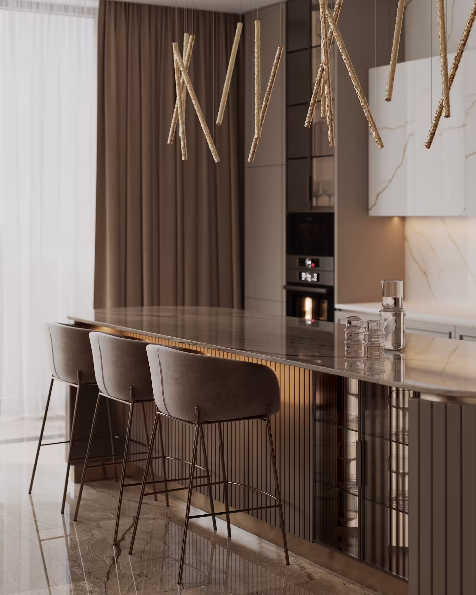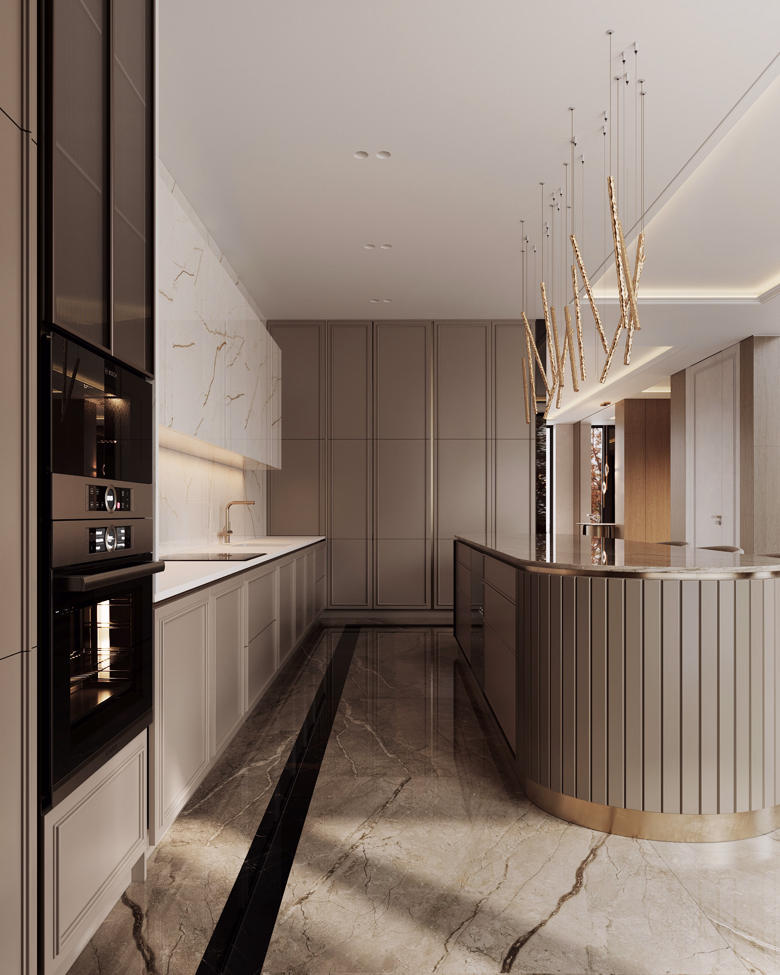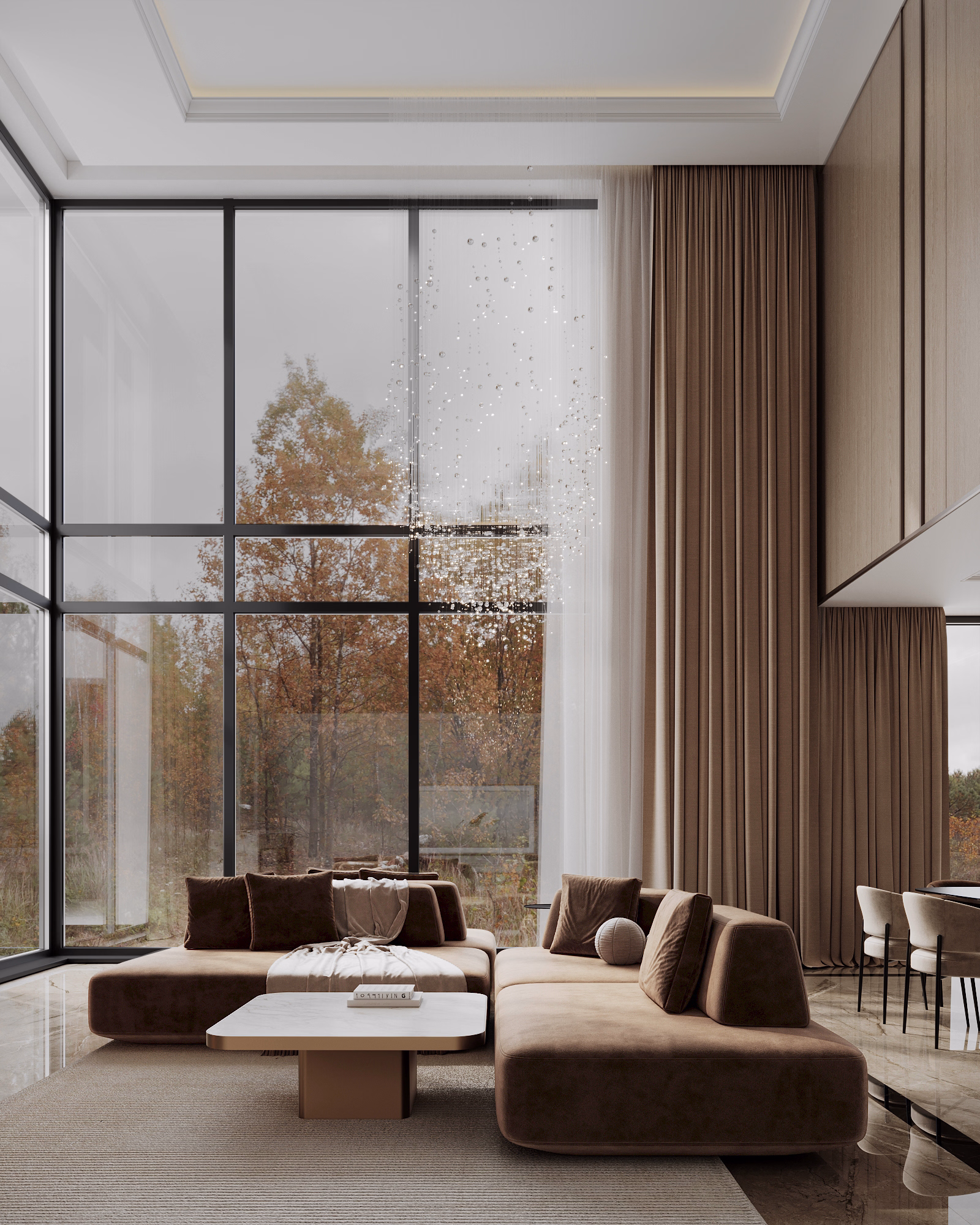 Этот проект воплощает современное пространство с утонченными деталями неоклассики, создавая элегантную и гармоничную атмосферу для комфортной жизни. Основная идея — сохранить стильное и изысканное пространство, в котором каждая деталь подчеркивает статус и качество. Особенность дома — сложное двухуровневое планирование, акцент на простор и свет, подчеркнутые просторной кухней с островом и стильной лестницей. В зоне гостиной расположены тв зона, каминная зона и современный модульный диван, что создает уютную и функциональную зону отдыха. В отделке использованы натуральный шпон, зеркала с фрезеровками, керамогранит — всё в нейтральных, природных оттенках, придающих пространству тепло и выразительность. Планировка и материалы тщательно подобраны, чтобы подчеркнуть изящество классических деталей и современную гармонию, делая дом эстетичным и максимально комфортным для повседневной жизни.